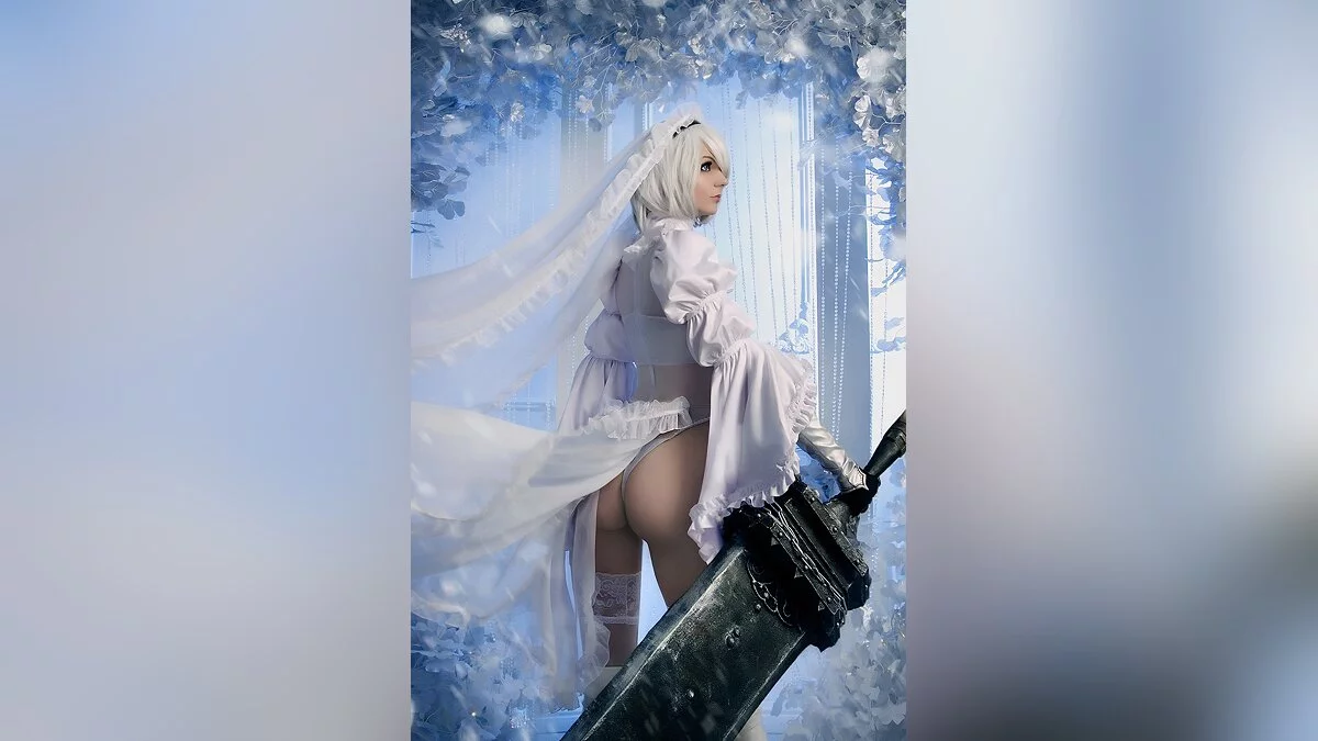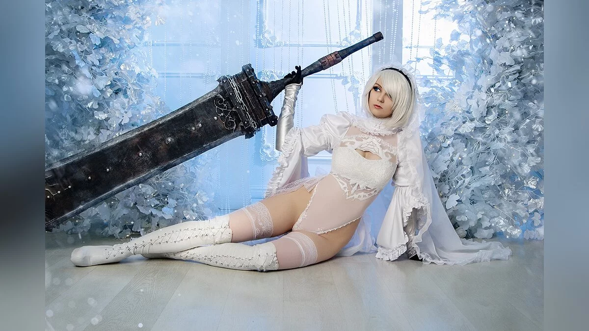 Меня давно привлекали дизайны Sakimi-chan, в особенности образ невесты 2B в белом. Но как-то не решалась на него долгое время. А в преддверии Нового года стала думать над праздничным образом, обычно это неканоничные костюмы. Увидела у нас в студии новую белоснежную локацию, а ещё как раз недавно вышли большие фигурки чёрной и белой невесты по артам Sakimi-chan. Всё это подтолкнуло меня к косплею.