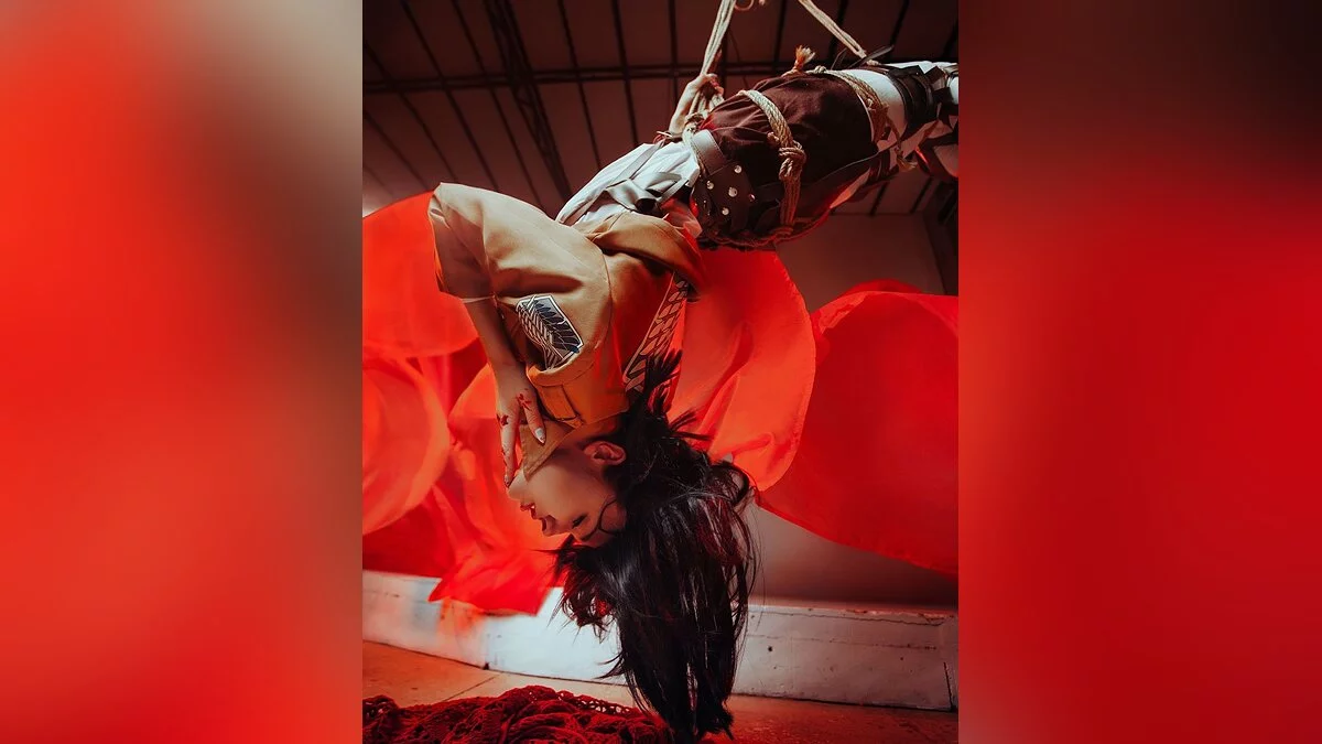 Nelly совместила образ Микасу с эстетикой шибари (эротичным связыванием). В последнее время это направление стало весьма популярно в мире косплея. Фотограф — Aster Shade (признано в России экстремистской организацией).