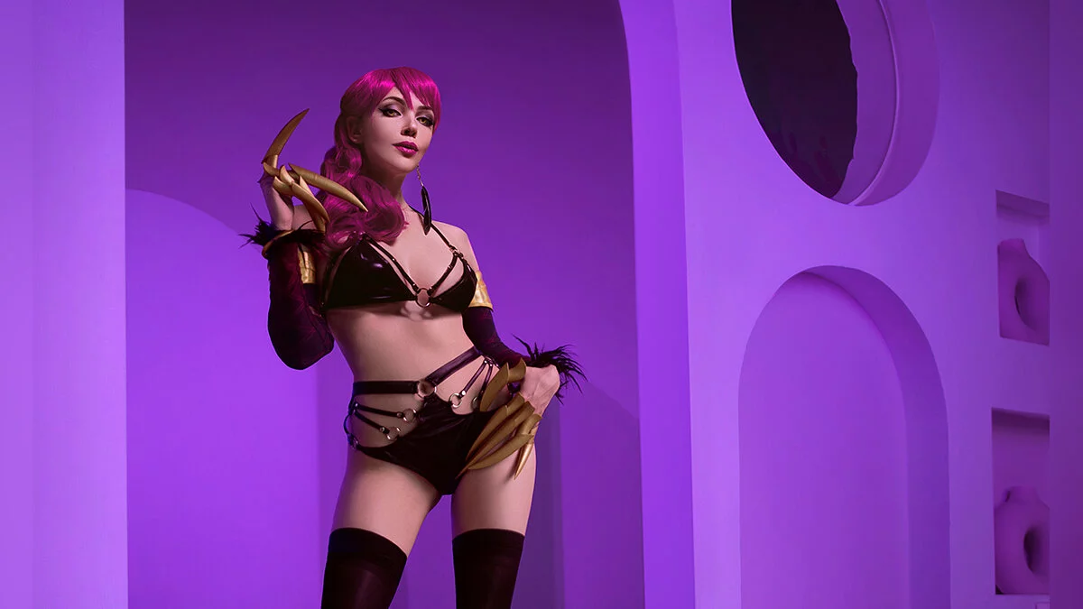 Эвелинн — очень притягательный, сильный и харизматичный женский персонаж. Она источает опасность и сексуальность. С такой героиней интересно работать, причём как участвовать в фотосете, так и воссоздавать её визуал во время ретуши. А клипы и костюмы участниц группы K/DA дают большой простор для творчества. К тому же я похожа на Эвелинн чертами лица.