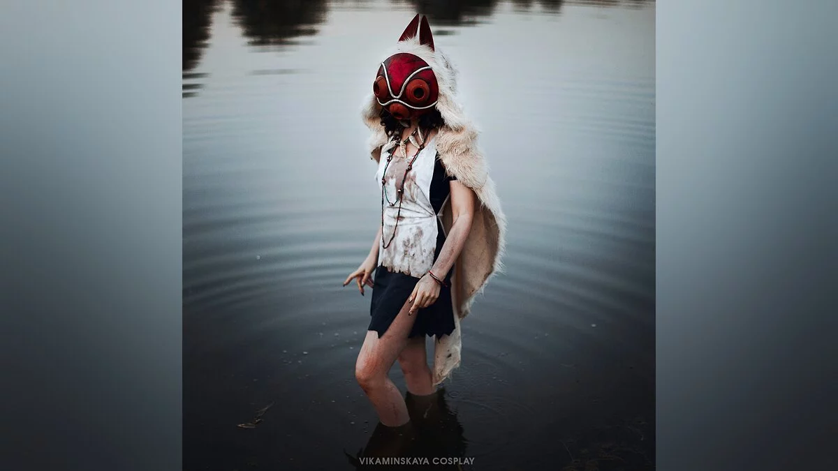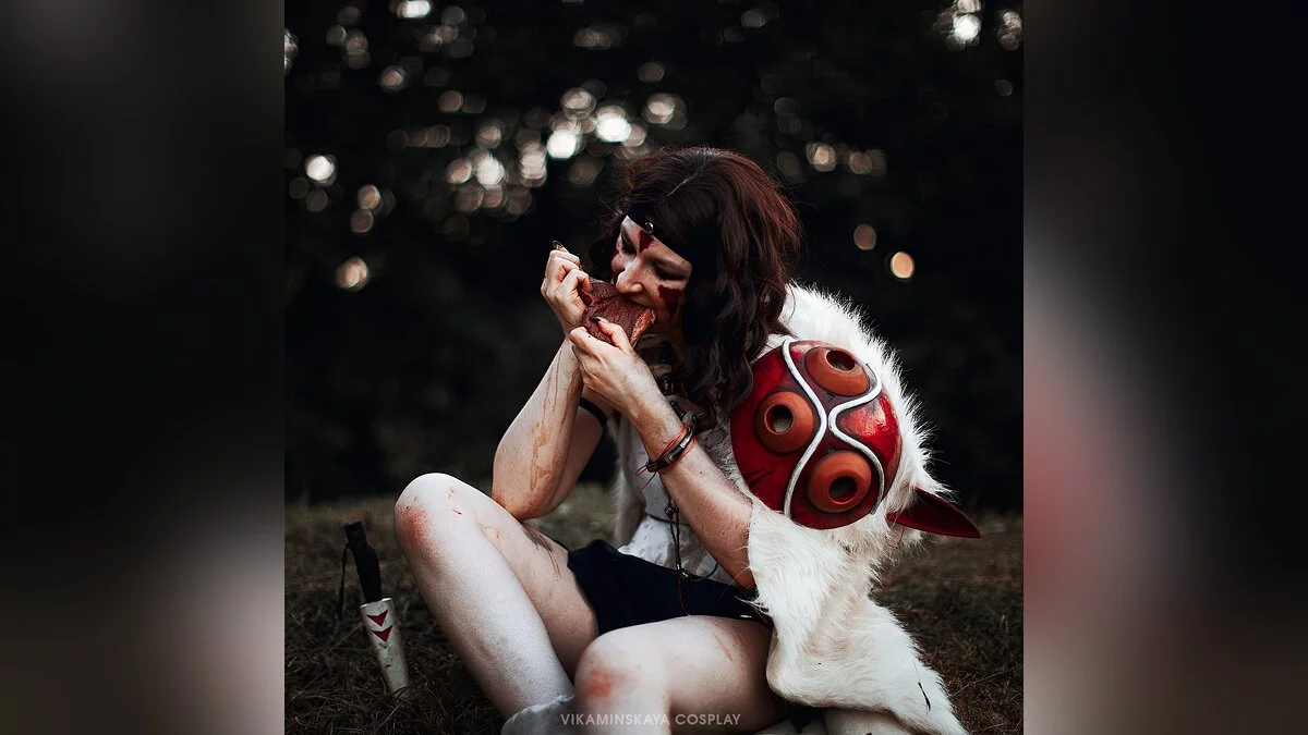 Я считаю, что принцесса Мононоке — один из любимых персонажей Миядзаки, на которого обязательно стоит сделать косплей. Сама съемка прошла максимально атмосферно и круто, я бегала по холмам, залезла в городской пруд, валялась в грязи, обливалась говяжьей кровью и грызла сырой кусок мяса на зависть всем собакам в парке. В общем, мы добились максимального реализма!