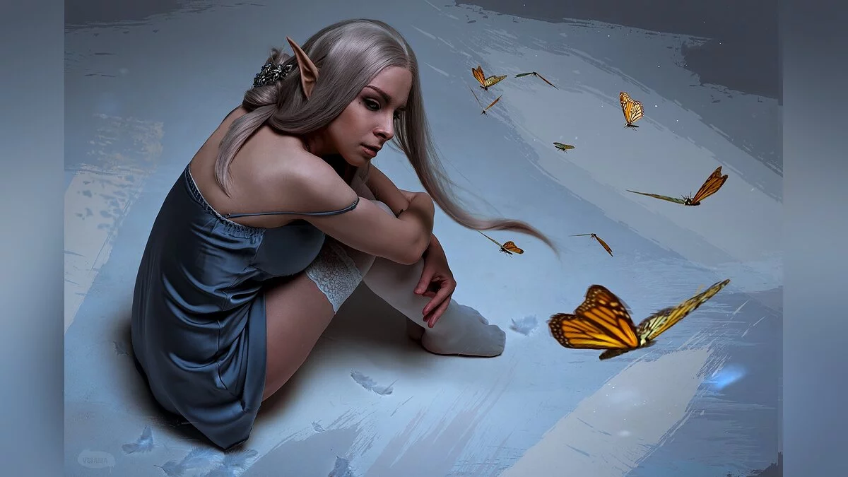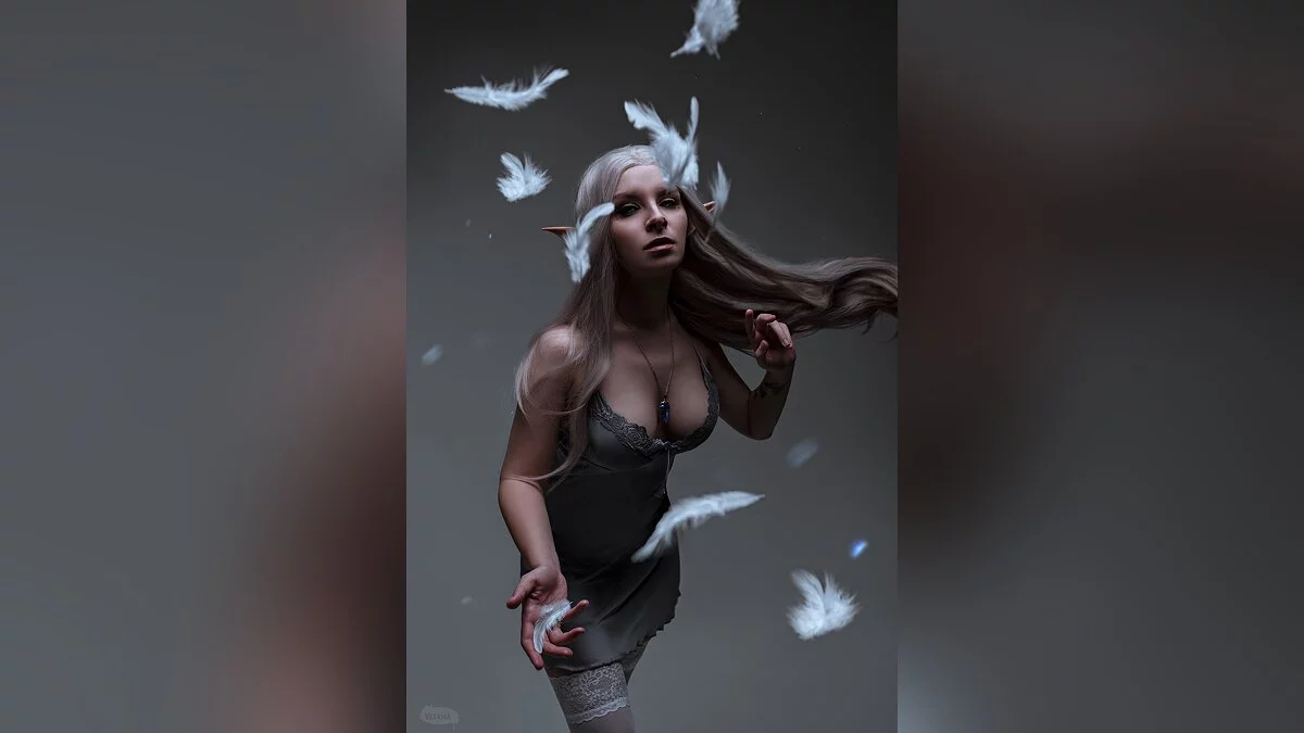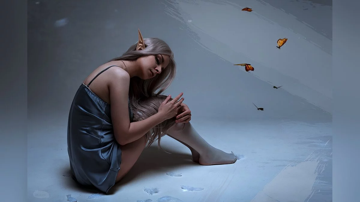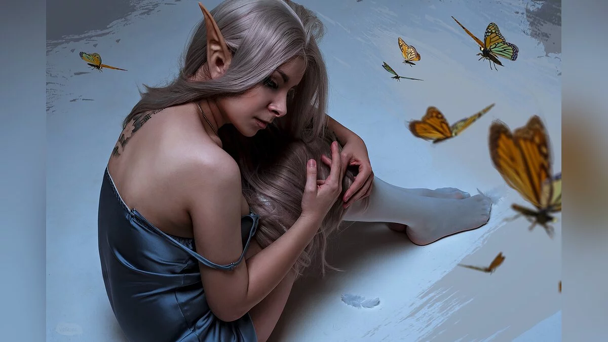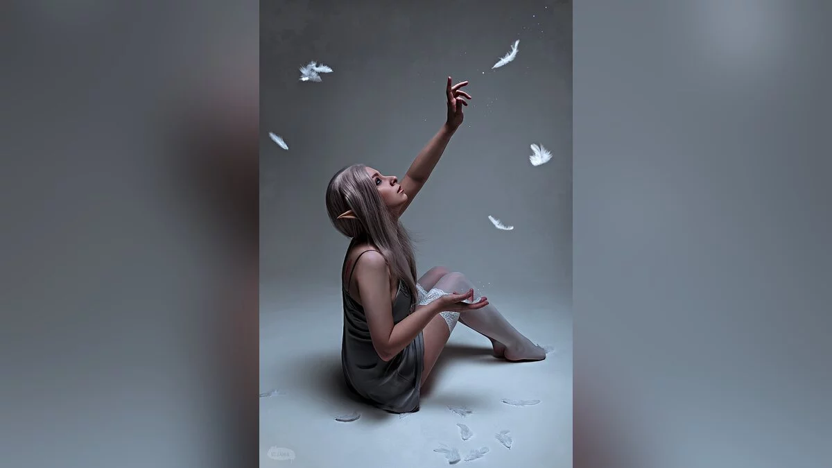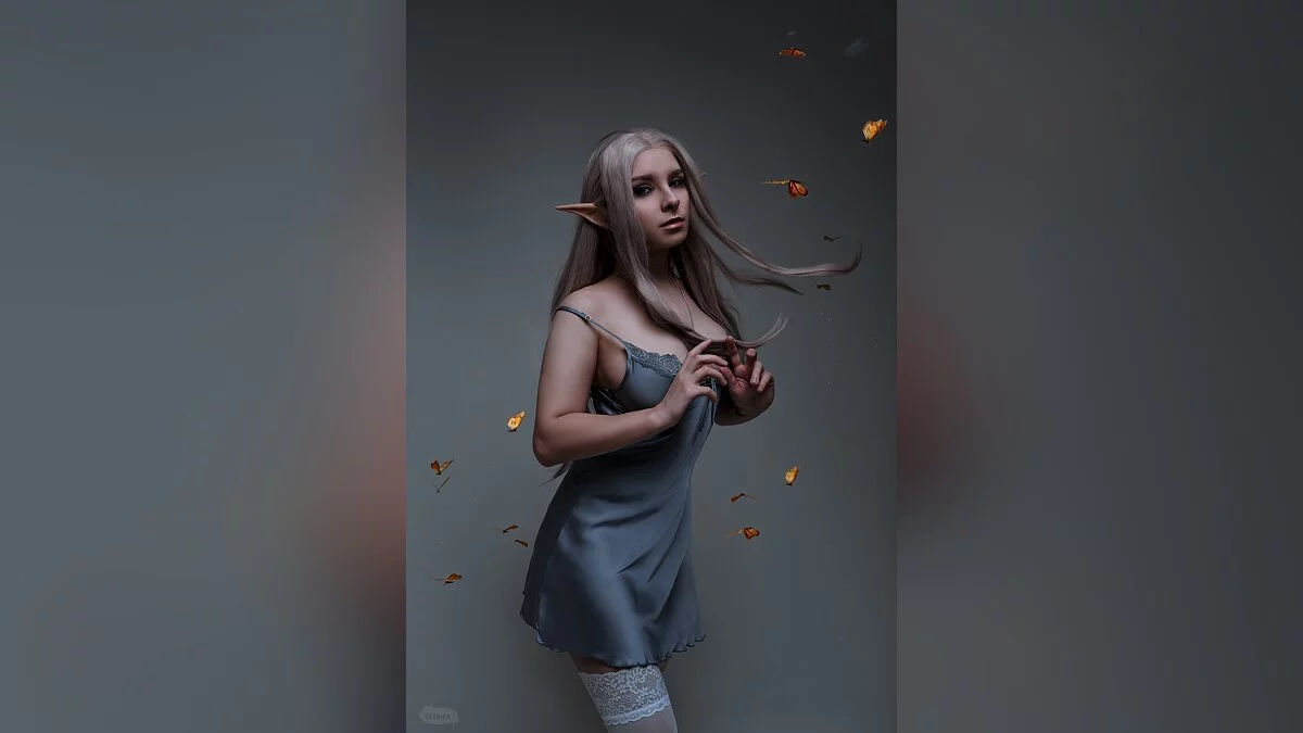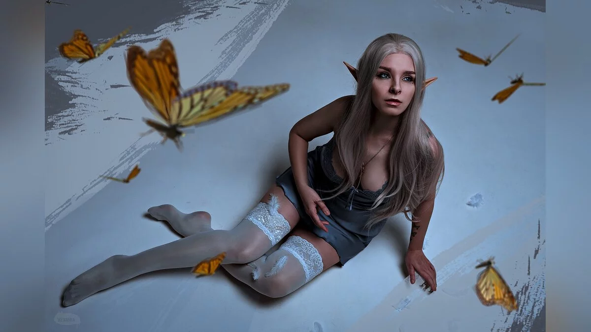 Однако съёмку мы отменять не стали. Решили поработать над минималистичными образами на грани ню. Мы с Вес (фотографом) любим эльфов, творчество художника WLOP и эстетику. Так что светловолосая эльфийка в перламутрово-серых тонах нам подошла идеально. Бабочки и перья на итоговых фото — тоже дань уважения WLOP и цветовой гамме «Призрачного Клинка».