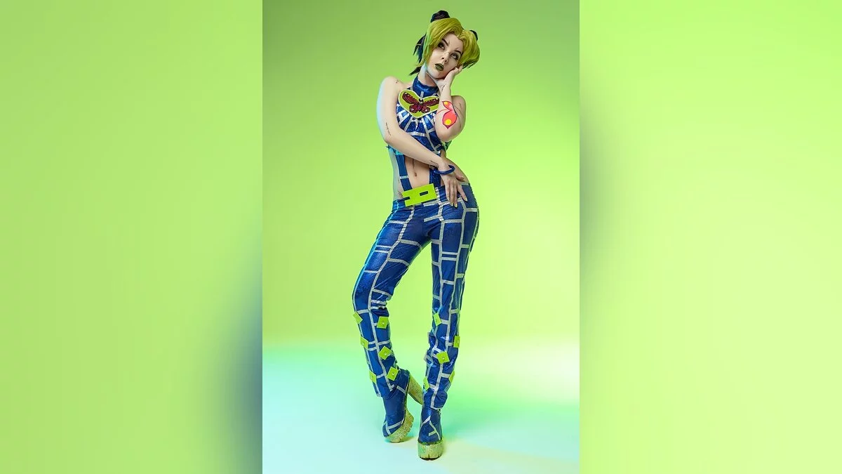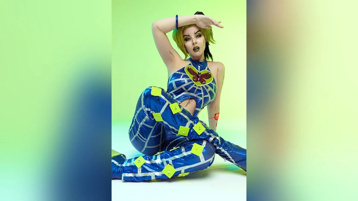 Аниме-сериал JoJo's Bizarre Adventure рассказывает о людях, которые умеют преобразовывать духовную силу в особые умения. Например, Джолин научилась превращать своё тело в тонкие нити. С их помощью она может как убивать врагов, так и скрываться от них. Косплей на эту героиню сделала Helly Valentine.