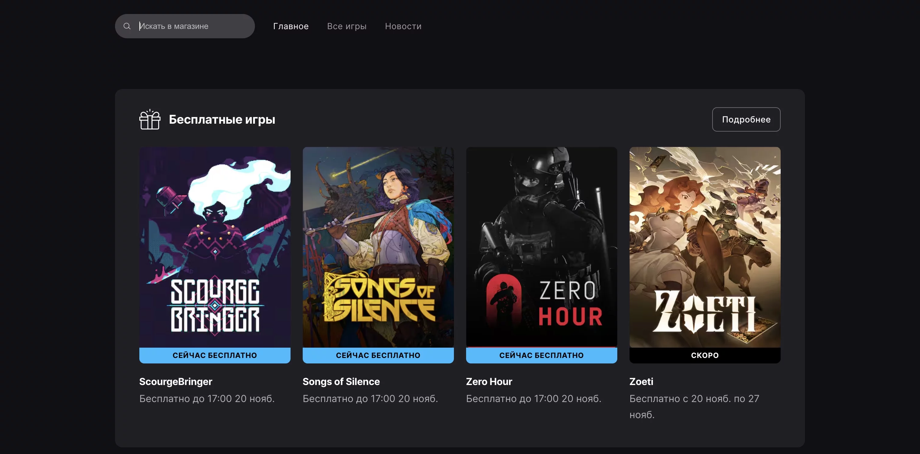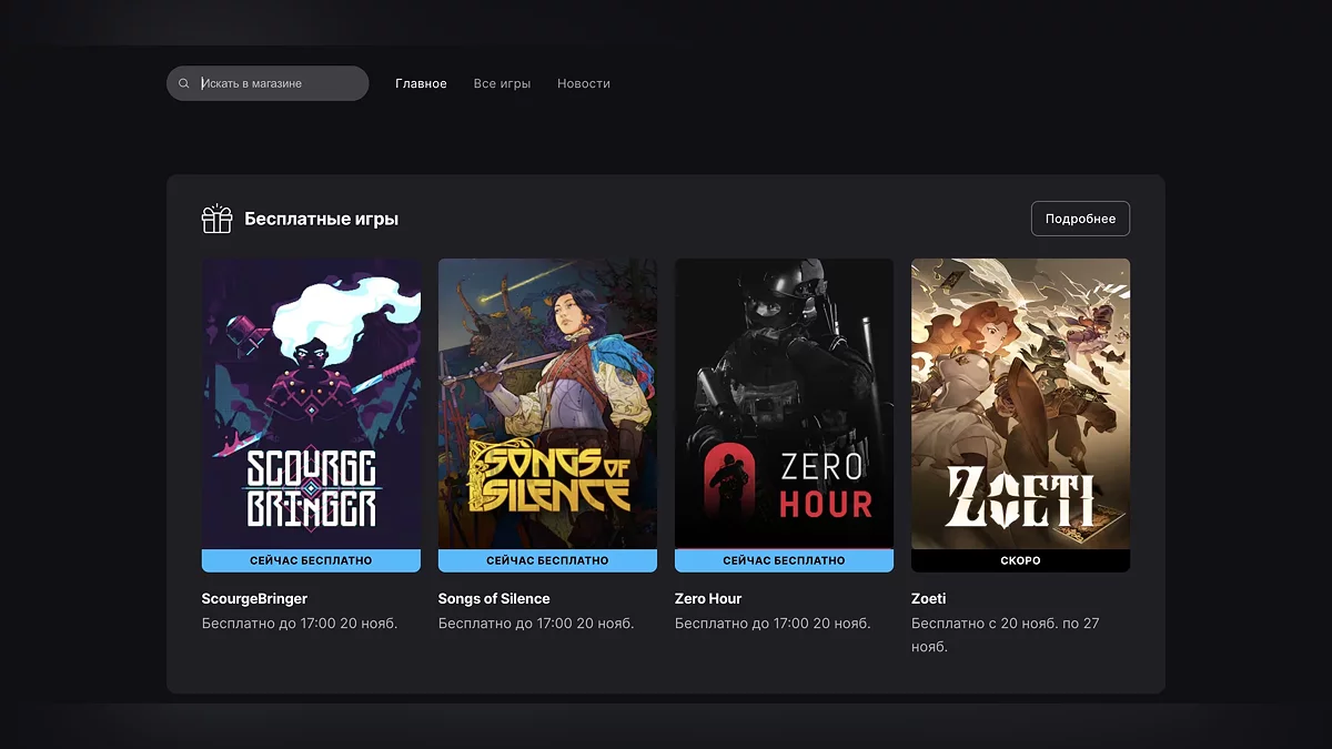 Эксклюзивные соглашения с разработчиками позволяют EGS периодически получать громкие релизы раньше конкурентов. В итоге по ассортименту и предложениям магазин выглядит очень уверенно и остаётся одной из самых привлекательных площадок на рынке.