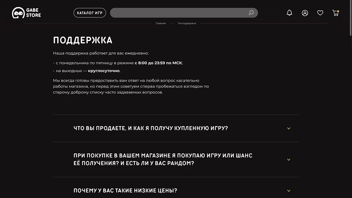 Служба поддержки работает по будням с 8:00 до 23:59 (МСК), в выходные — круглосуточно, и связаться с ней можно по адресу support@gabestore.ru. Писать можно для оформления возвратов и решения других проблем при покупке. Помимо этого, на сайте есть подборка самых популярных пользовательских вопросов и ответов на них.