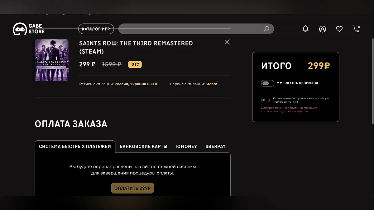 Приобрести игру в Gabestore довольно просто: проект закидывается в корзину, после чего можно выбрать способ оплаты. Из доступных вариантов: