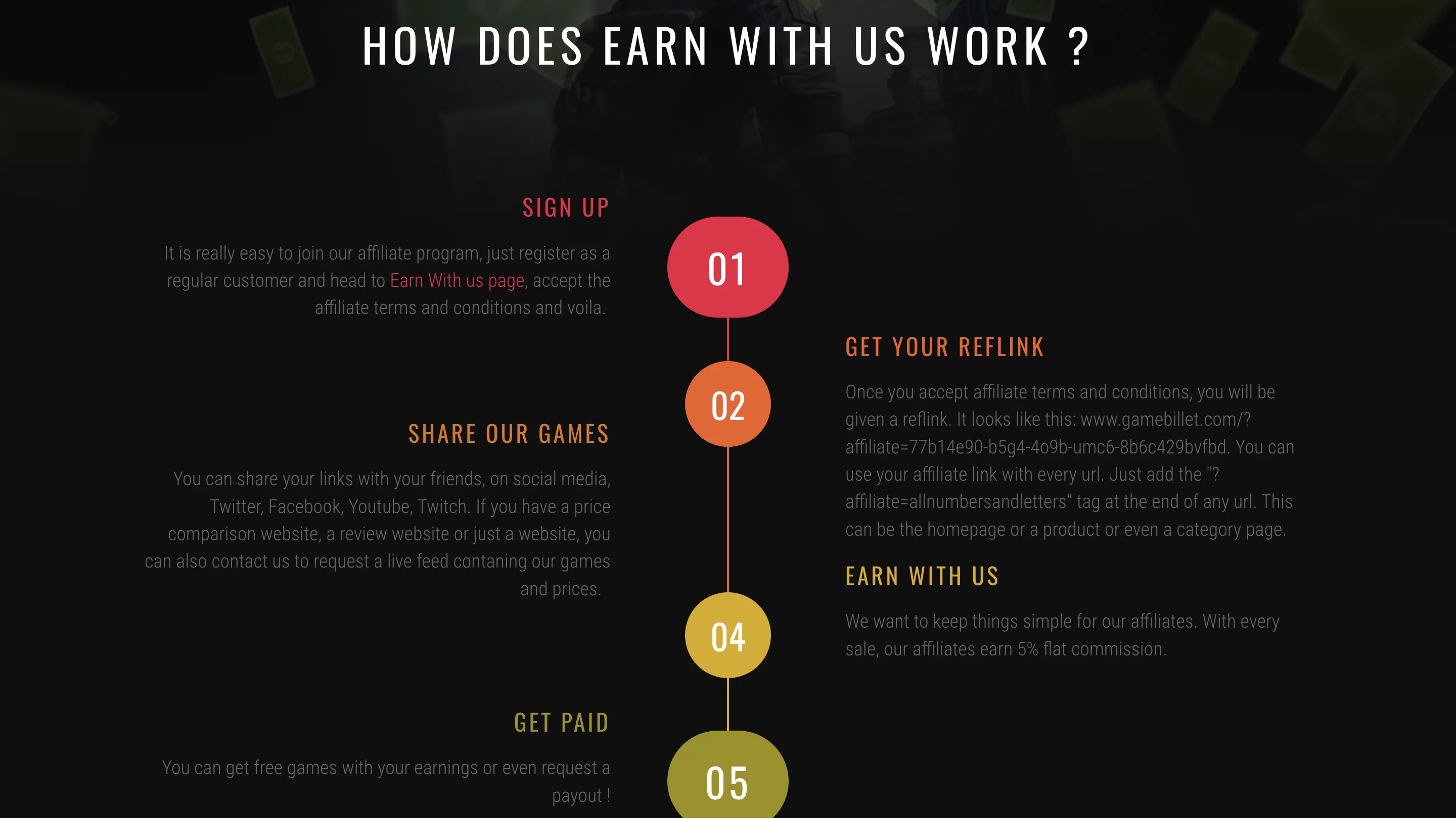 Главная особенность GameBillet — реферальная программа. Пользователи могут делиться ссылками на игры в соцсетях и получать 5% с каждой покупки по своей ссылке. Деньги можно потратить на новые игры или вывести на счёт.