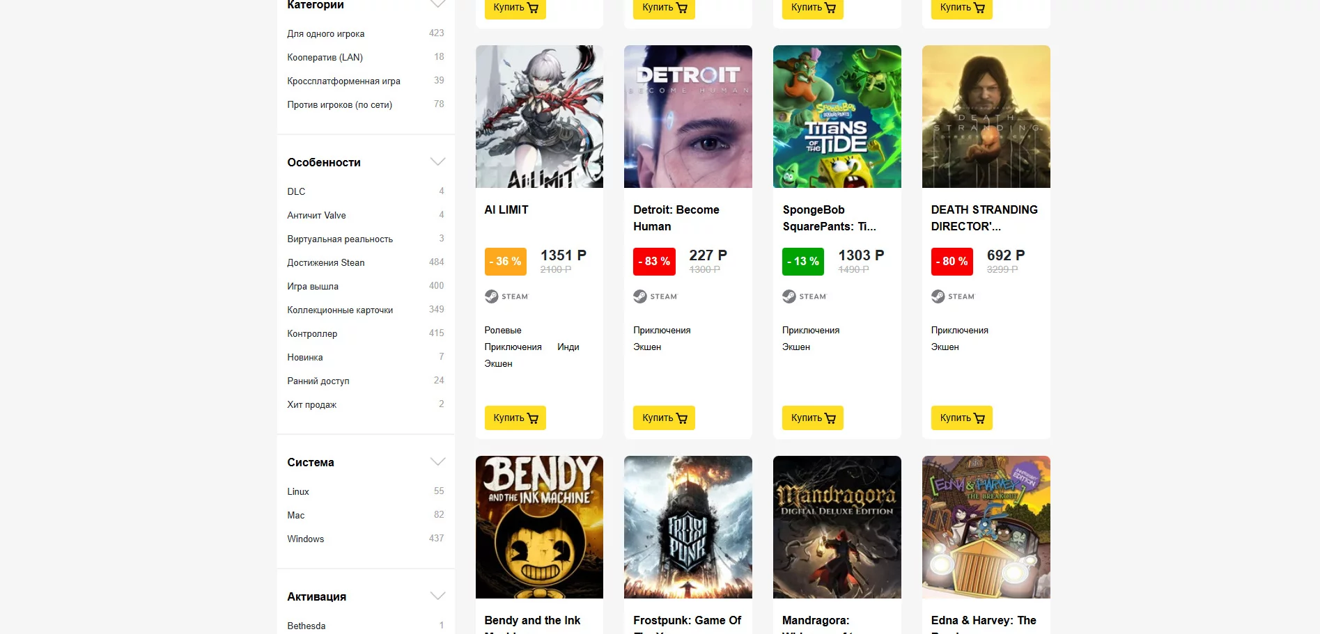 Ассортимент магазина не отличается большим количеством новейших игр, однако здесь можно приобрести тайтлы, которые уже зарекомендовали себя и получили высокие оценки в геймерском сообществе. Активация ключей возможна для нескольких платформ: Steam, Origin, GOG и Uplay. Также предусмотрена удобная сортировка по широкому набору параметров, что делает поиск и покупку значительно быстрее и удобнее.