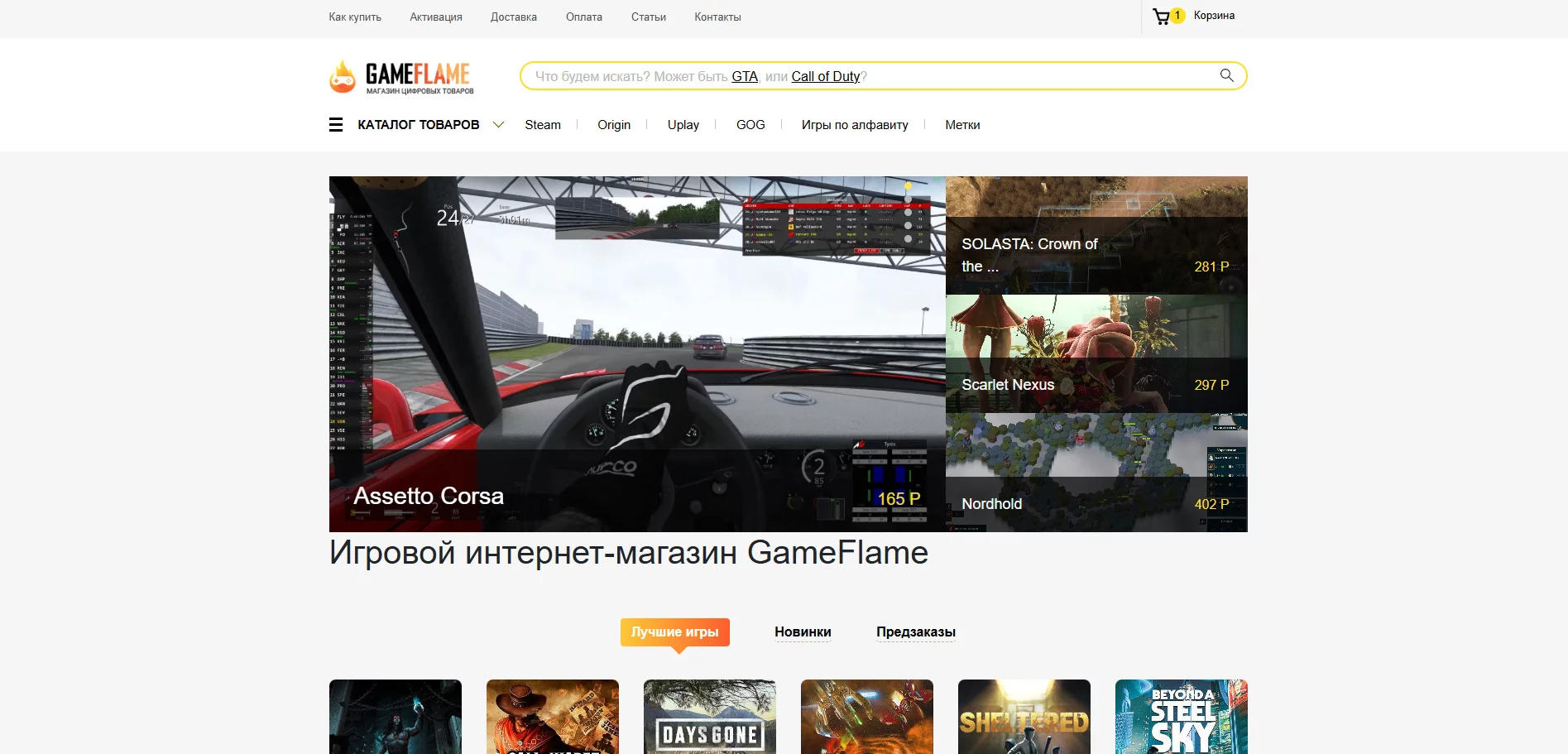 GameFlame — это онлайн-магазин, продающий ключи для игр на ПК. Здесь нет самых новых релизов, однако представлен хороший выбор игр, вышедших несколько лет назад. Магазин продолжает развиваться и постепенно расширяет каталог. Цены достаточно приятные и ниже, чем у официальных ритейлеров.