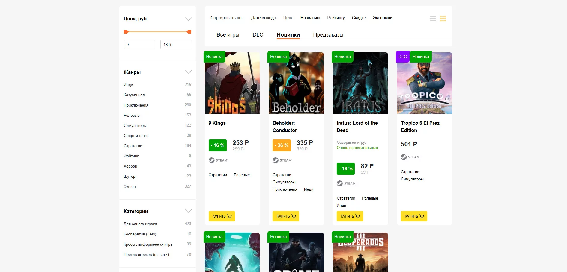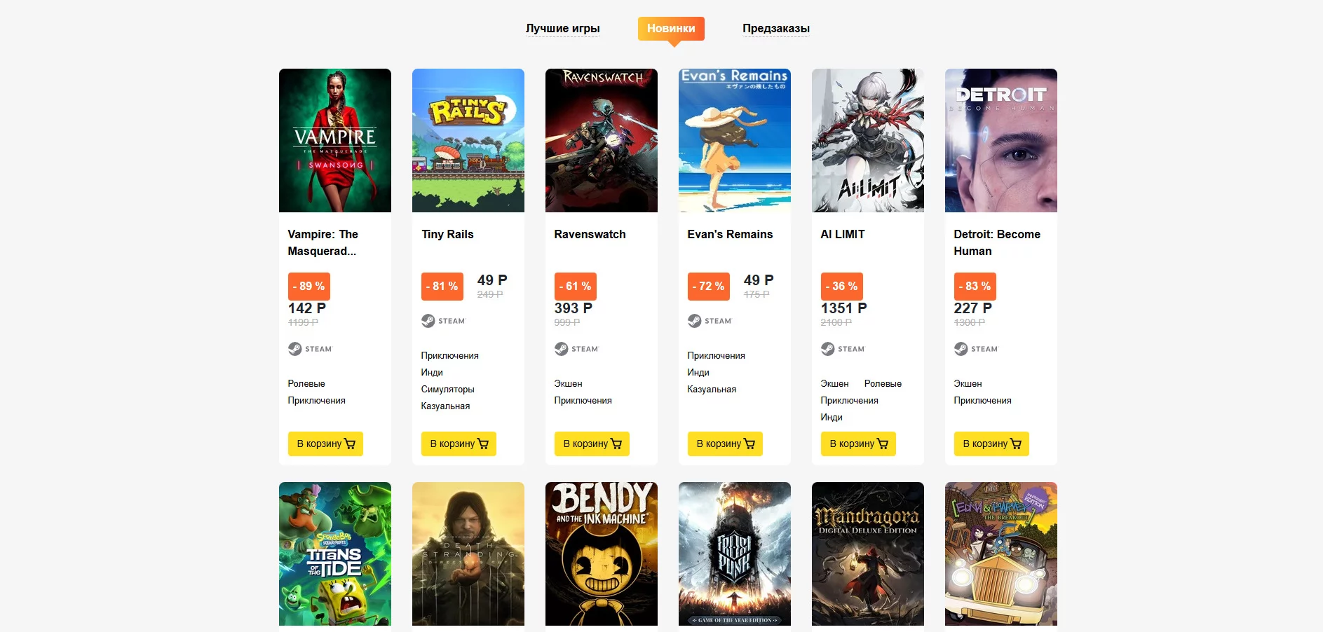 На главной странице магазина размещены самые интересные игры, доступные для покупки, а также удобные категории — «Новинки», «Лучшие игры», «Предзаказы». Это позволяет быстро перейти к нужному разделу и выбрать подходящий товар.