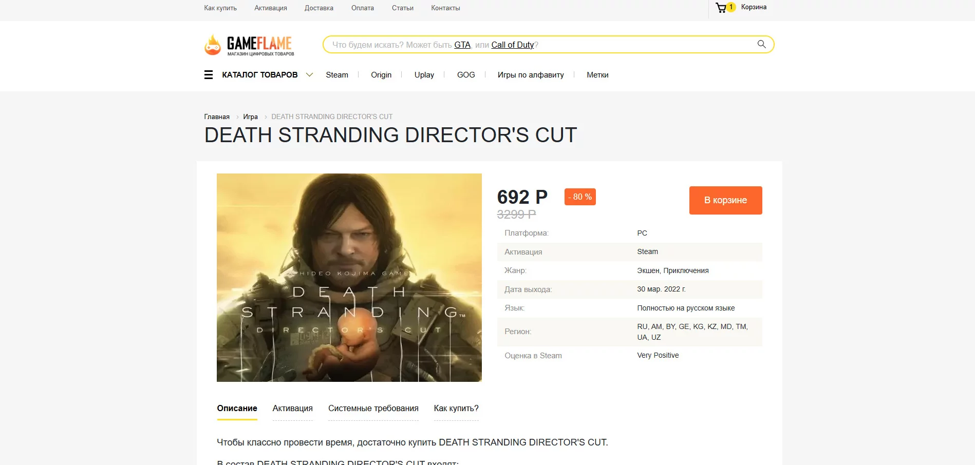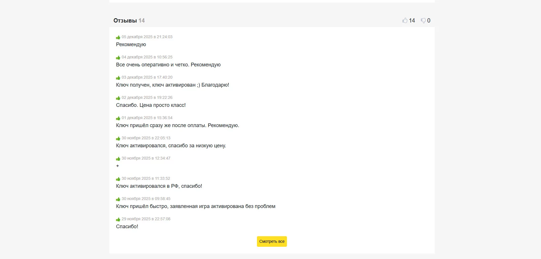 Карточки товаров выполнены в минималистичном стиле и содержат только основную информацию. Здесь можно узнать, на какой платформе активируется ключ, регион его доступности, язык игры, прочитать описание, инструкцию по активации и несколько дополнительных деталей. Особое удобство создают комментарии покупателей, позволяющие убедиться, что ключ действительно рабочий и активируется мгновенно.