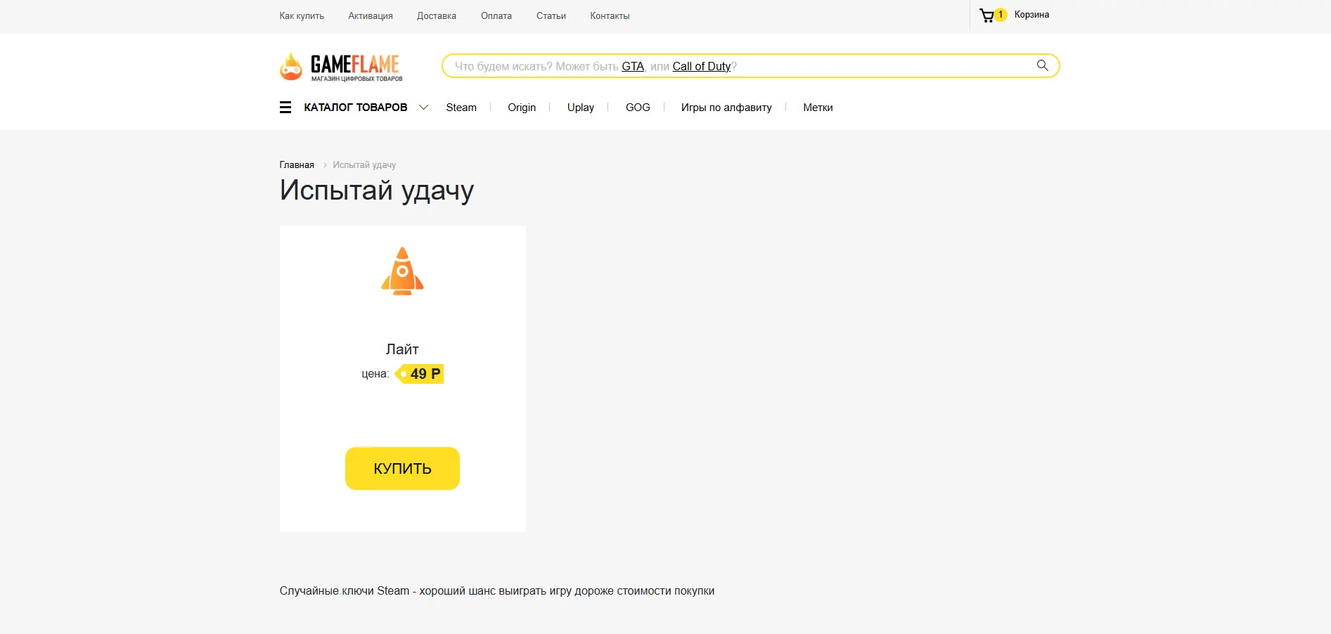 Уникальной особенностью данного магазина является возможность покупки рандомных ключей всего за 49 рублей. Эта опция позволяет испытать удачу и попытаться получить ключ от дорогой игры за минимальную цену.