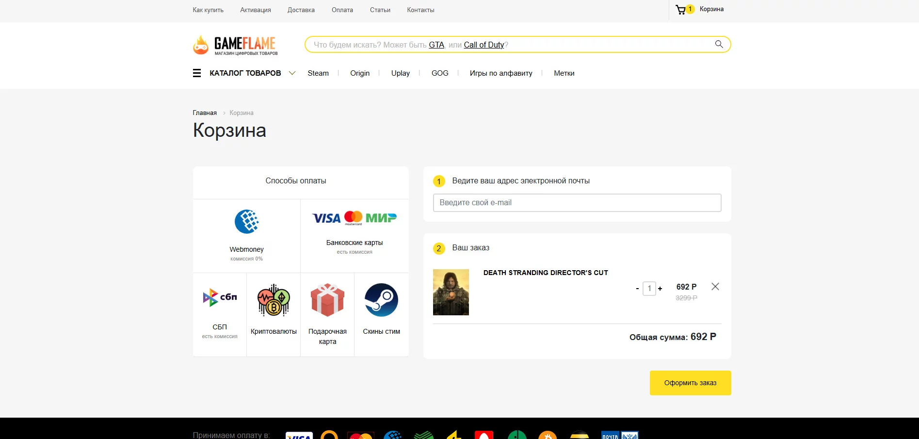 Навигация удобная: есть разделение по категориям и по платформам активации ключей. Оплата проходит мгновенно, и ключ быстро поступает на почту, указанную при регистрации. Магазин работает для российских пользователей и поддерживает большое количество платёжных систем, включая оплату скинами из Steam. Цены, разумеется, указаны в рублях.