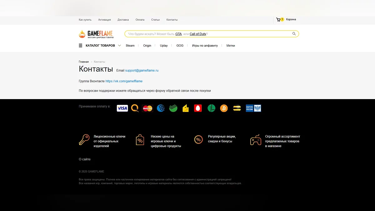 Поддержка работает через форму обратной связи, которая появляется после покупки ключа, а также через электронную почту, указанную в разделе «Контакты». Кроме того, у магазина есть собственная группа во «ВКонтакте», которая находится в стадии активного развития.