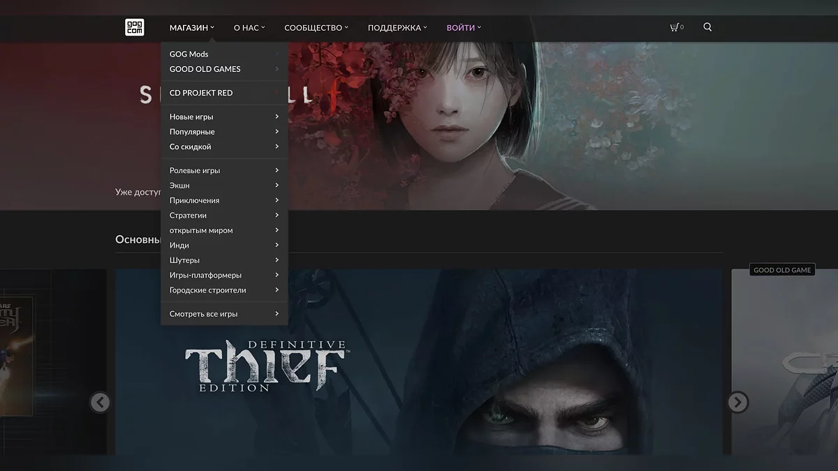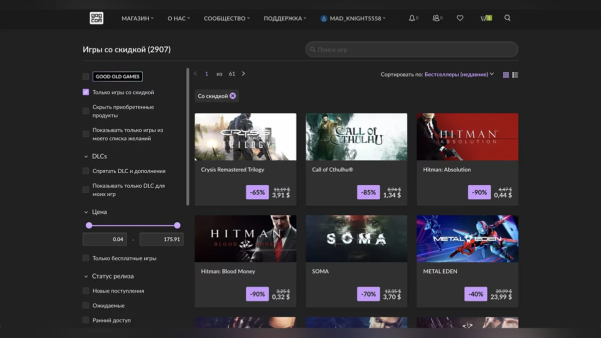Каталог GOG.com организован достаточно грамотно. Работает удобный поиск и фильтры: можно отобрать игры по жанрам, платформам, наличию специальных изданий или бонусного контента. Структура меню проста и понятна, новинки и акции вынесены на главную страницу, что облегчает навигацию.