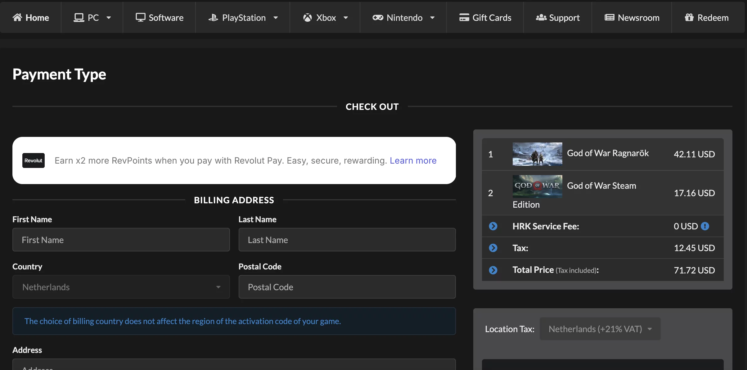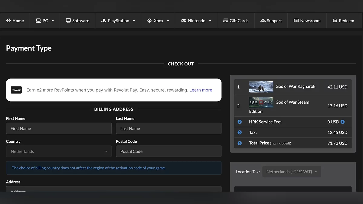 Процесс покупки игр на сайте реализован вполне стандартно. Вы кладёте игру в корзину, переходите в неё, вводите свой адрес для обработки данных и оплачиваете игру. Следует отметить, что при оплате из некоторых стран предусмотрен налог.