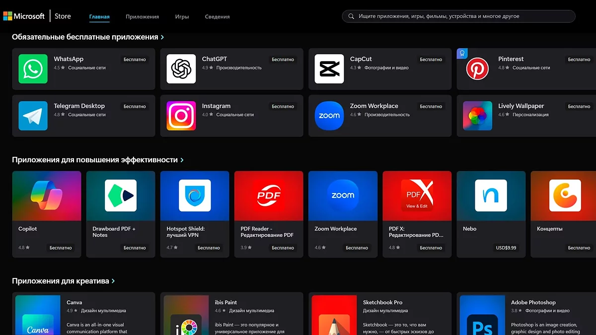 Структура магазина гибридная. Во вкладке «Главная» собраны все типы контента: от небольших программ для работы с файлами и казуальных инди-игр до мощных графических редакторов, AAA-блокбастеров, подписочных сервисов и всего набора социальных сетей. Категоризация присутствует, но не полностью отделяет игровые разделы от общего ассортимента Microsoft Store. Поиск универсальный: он выдаёт совпадения по всему каталогу, поэтому в выдаче могут появляться сопутствующие программы, темы оформления, дополнения и приложения сторонних разработчиков. С точки зрения точности поиска это ожидаемо, но для пользователя, который ищет конкретную игру, результаты зачастую избыточны.