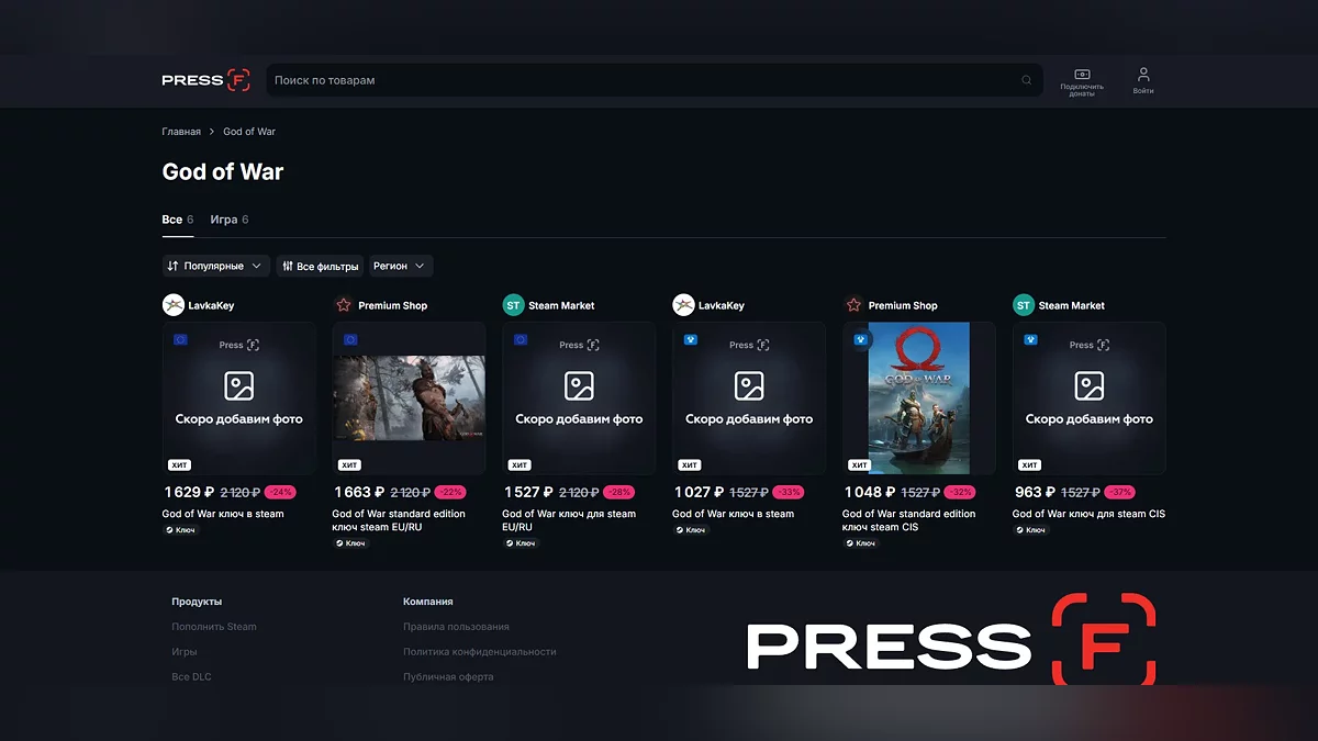 PressF — крупная платформа по продаже игр, подписок, подарочных карт, игровых предметов и других товаров, связанных с играми для ПК и мобильных... Подробнее
