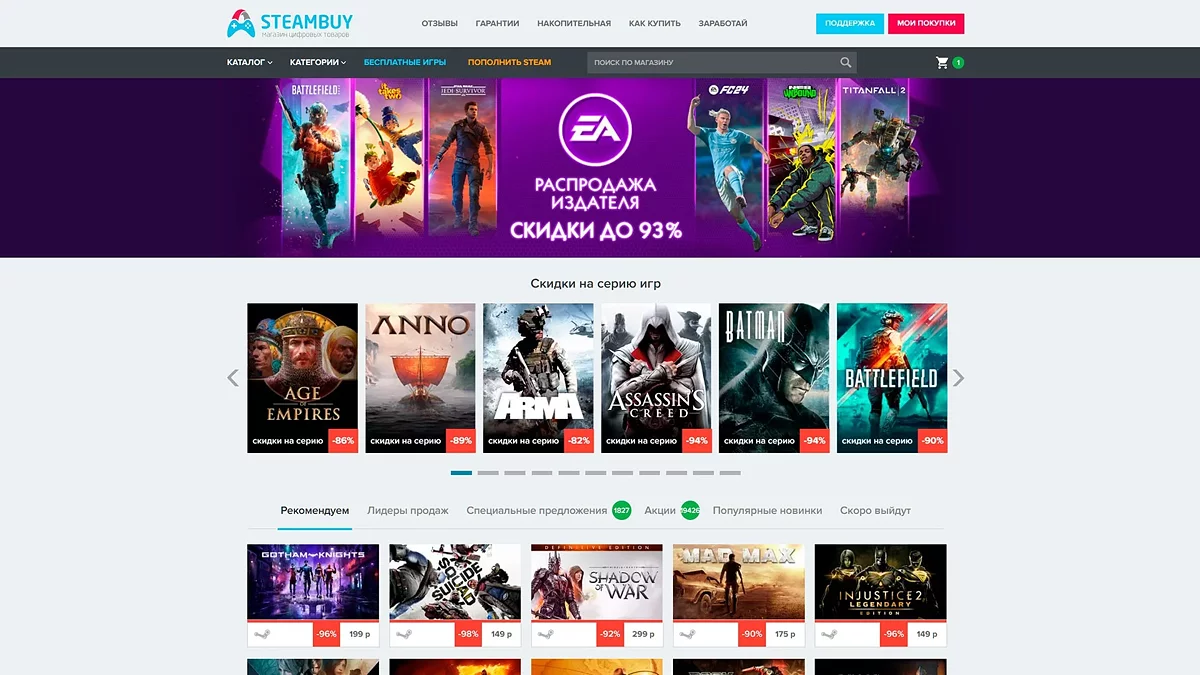 Главная страница Steambuy выстроена вокруг одной идеи — максимально быстро привести пользователя к выгодной и безопасной покупке. В «шапку» сайта вынесены страницы «Отзывы», «Гарантии» и «Поддержка», которые с первых секунд формируют ощущение надёжности и прозрачности сервиса.