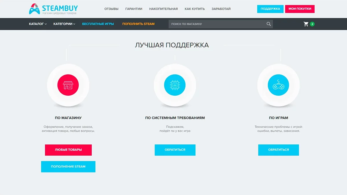 Система поддержки выстроена вокруг собственного интерфейса обратной связи на сайте steambuy.com и чётко разделена по типам задач: