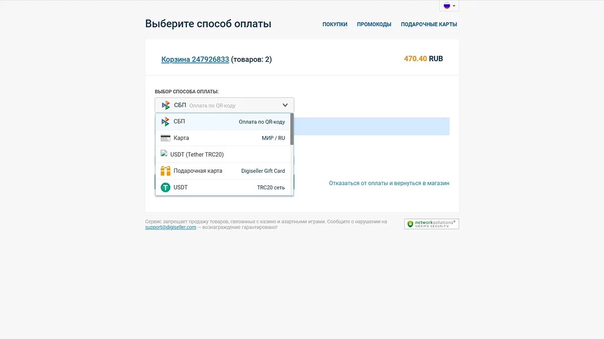 Цена в каталоге указывается без учёта комиссии платёжных агрегаторов. При переходе на внешний шлюз (например, oplata.info, pally.info) к итоговой сумме может добавится комиссия — как правило, в диапазоне от 1% до 7% в зависимости от выбранного метода. Финальная сумма всегда отображается до подтверждения платежа. На практике самым выгодным вариантом для пользователей из РФ и РБ остаётся СБП — с минимальной комиссией или без неё, тогда как оплата картами и криптовалютой может обойтись немного дороже из-за особенностей обработки транзакций.