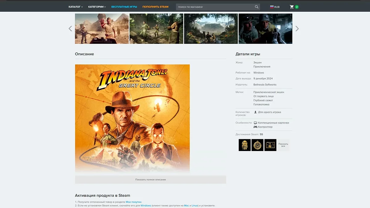 Карточка товара логично продолжает общую философию удобства и прозрачности. Помимо арта, цены и кнопки покупки, Steambuy сразу акцентирует внимание на критически важных деталях: тип клиента для активации, регион, наличие русского языка (как интерфейса, так и озвучки). Ниже размещены описание, скриншоты, трейлеры, системные требования и даже игровые режимы (одиночный, мультиплеер, кооператив). Сильная сторона: блок «Обратите внимание», где пошагово объясняется процесс активации, а также интеграция отзывов из Steam — пользователю не нужно покидать сайт, чтобы сформировать мнение об игре.