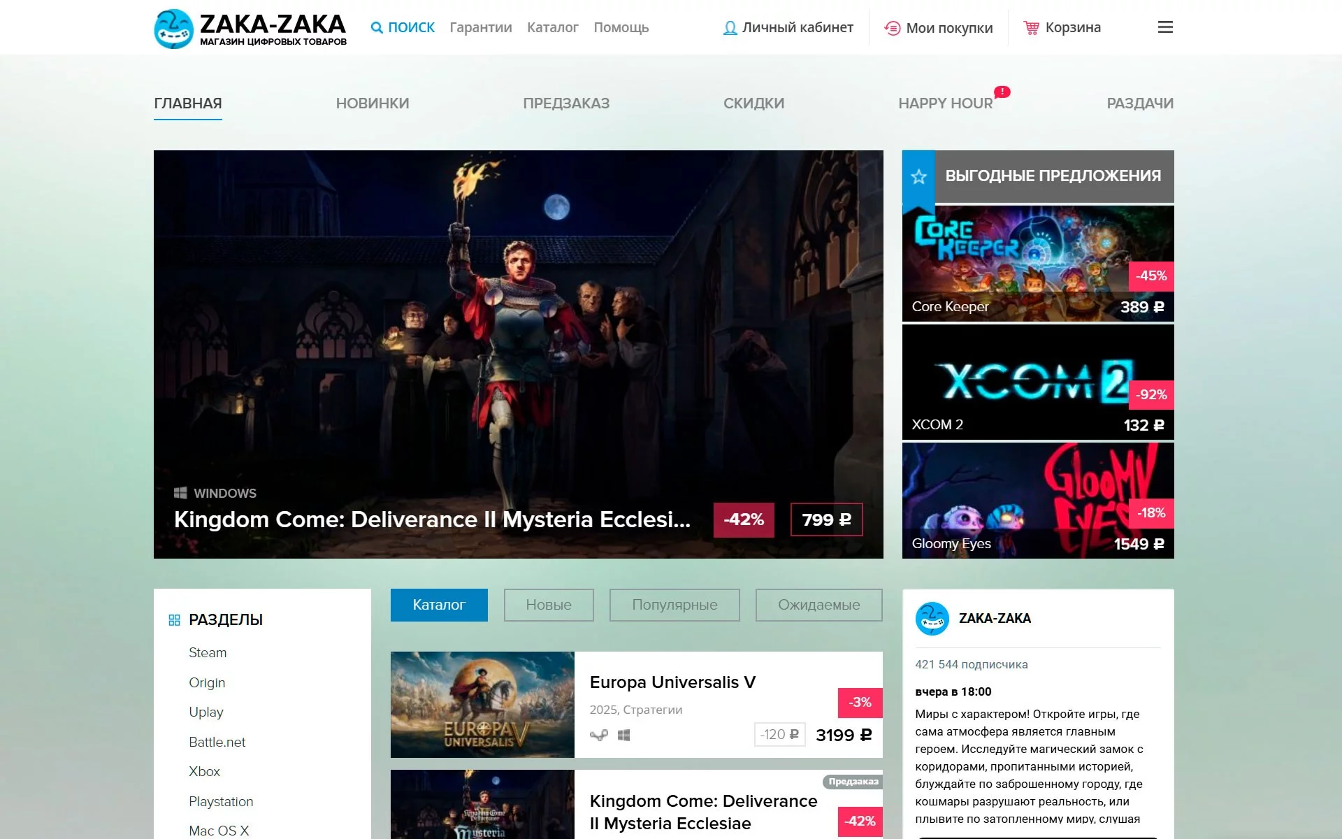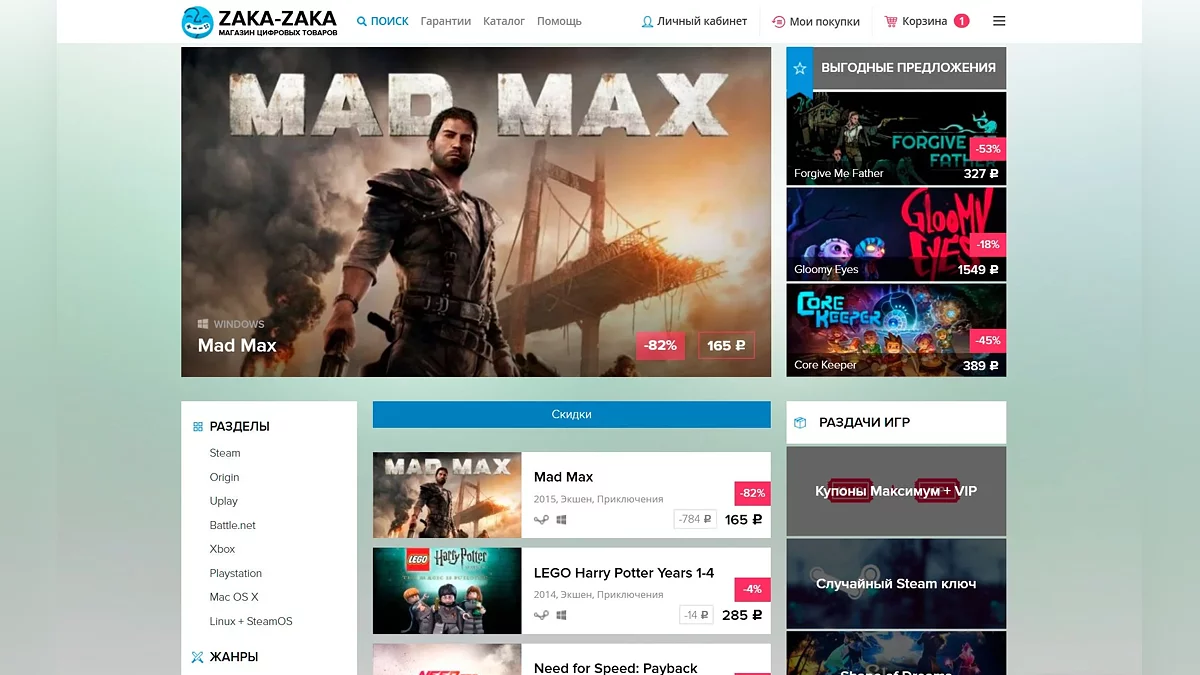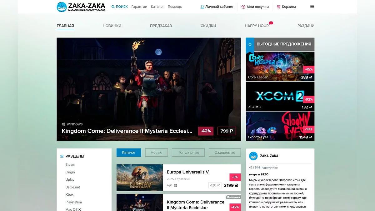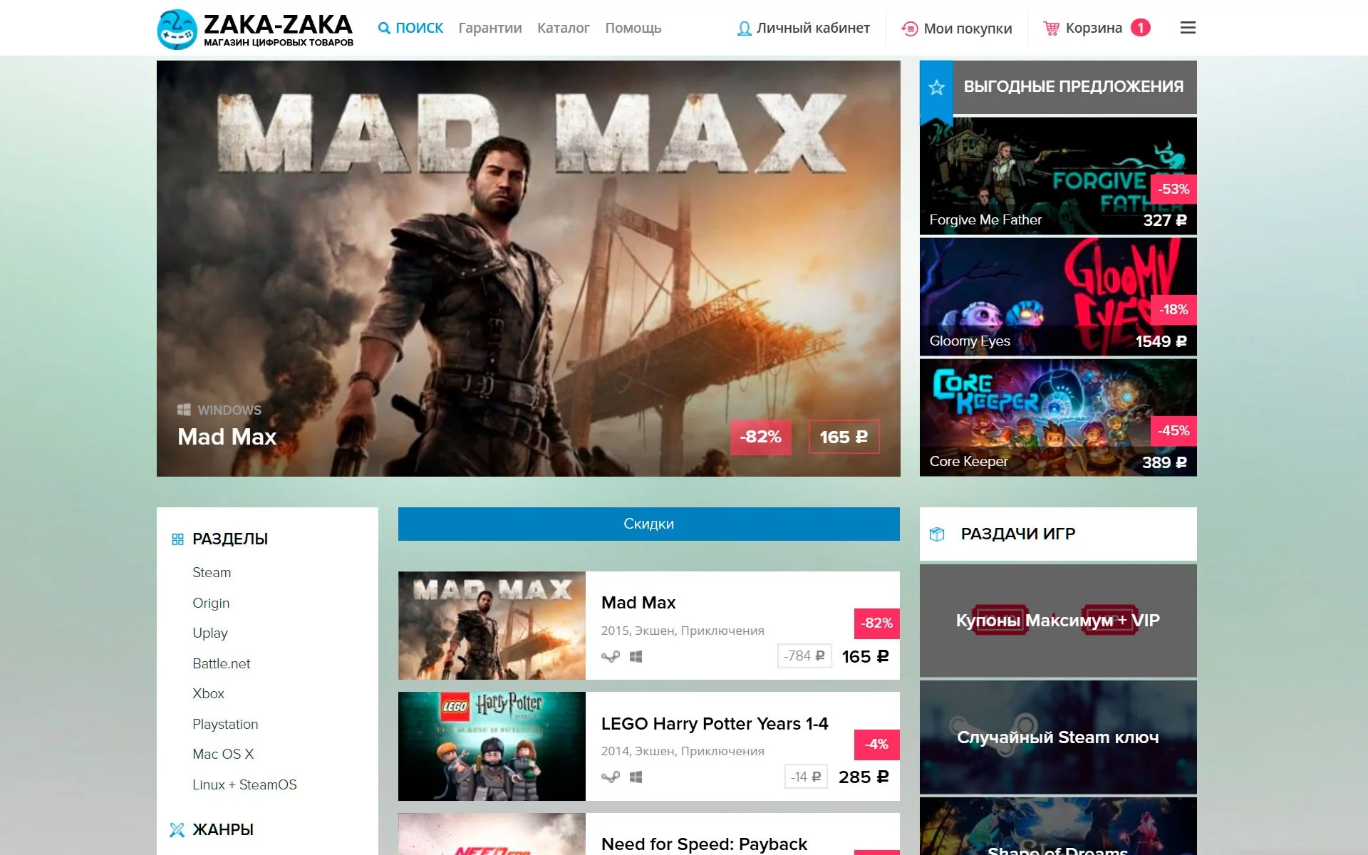 Zaka-Zaka.com — это онлайн-магазин компьютерных игр, где продаются лицензионные ключи и подарочные наборы для популярных платформ вроде Steam, Origin, Uplay и Battle.net. В отличие от универсальных площадок, здесь царит строгая специализация — только игры, никакого софта вроде Windows или Office.