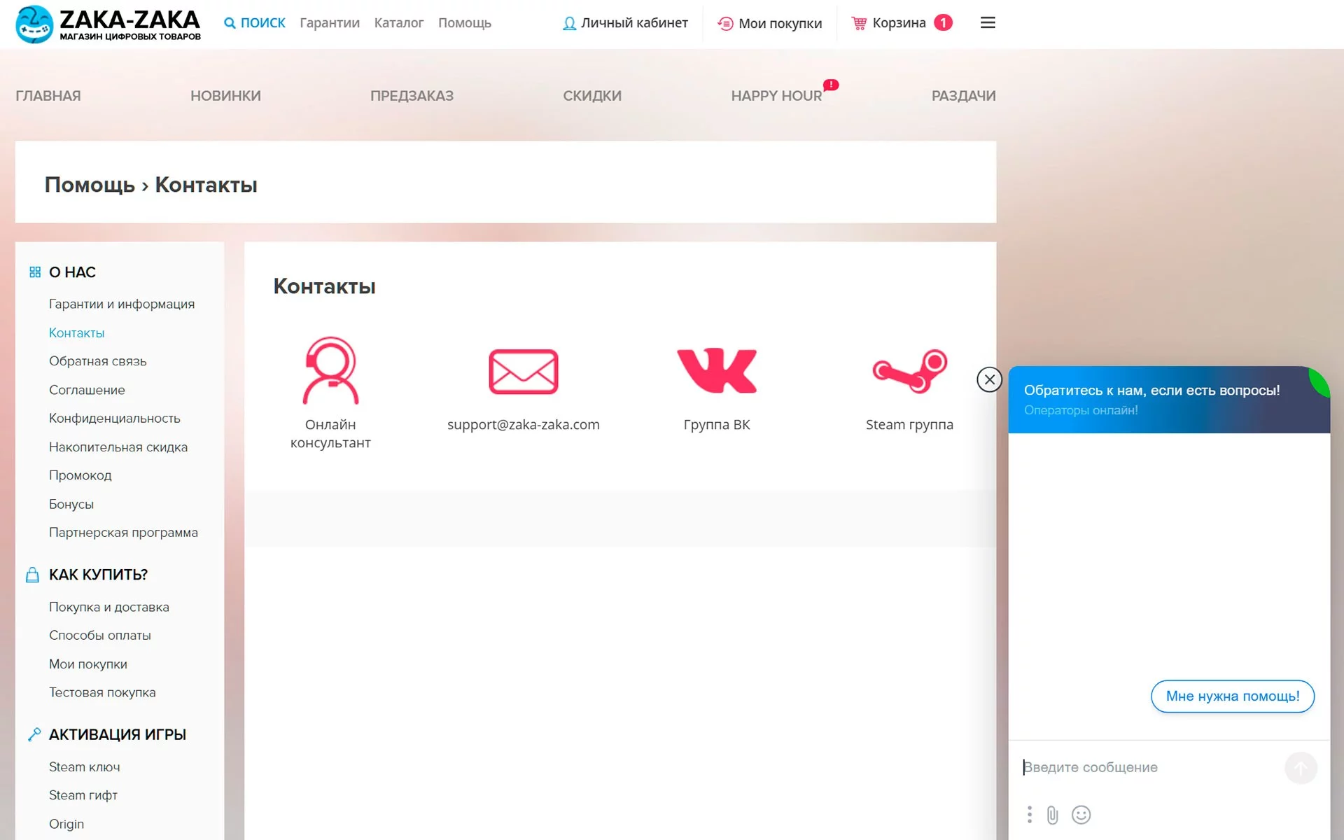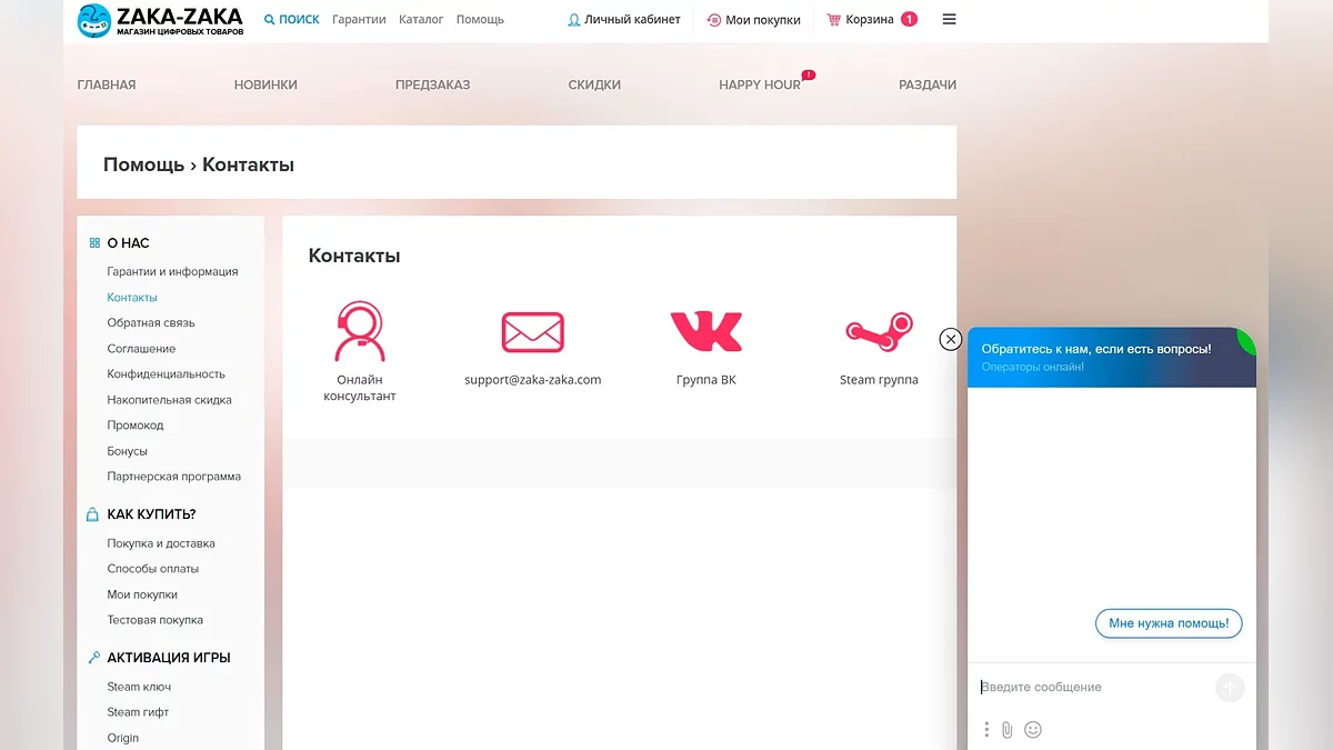 Связаться с поддержкой можно через e-mail (support@zaka-zaka.com) или форму обратной связи прямо на сайте. И вот здесь Zaka-Zaka приятно удивляет — операторы отвечают достаточно быстро, нередко через пару минут после обращения. В случае с нерабочими ключами замена часто происходит в тот же день, что заметно выделяет магазин среди конкурентов.