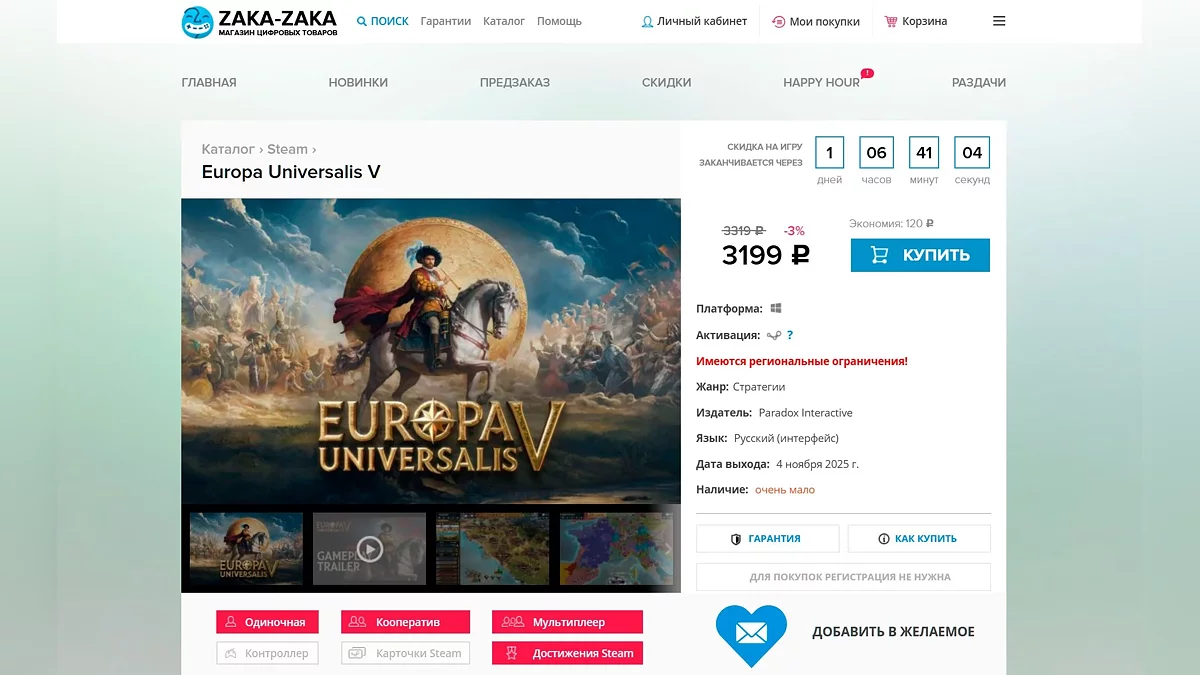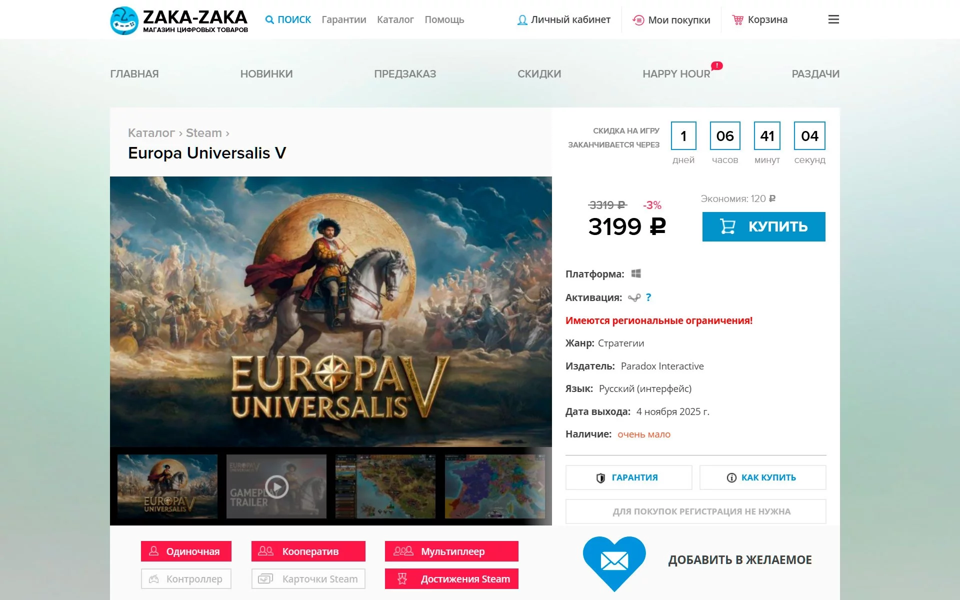 Zaka-Zaka.com — это специализированная площадка, которая делает одно дело, но делает его хорошо. Восемь лет на рынке не прошли даром — здесь знают, чего хотят геймеры: низкие цены, быстрая доставка, широкий ассортимент. Магазин идеален для тех, кто ищет игры по демпинговым ценам, готов мириться с региональными ограничениями, не планирует возвращать покупки, доверяет проверенным временем площадкам.