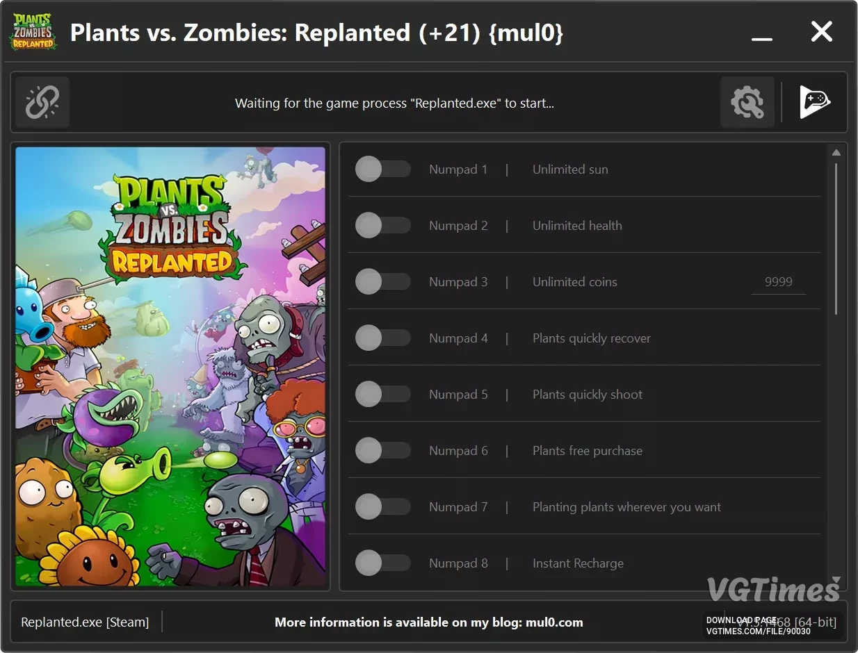 Версия игры: v1.5.1468. Процесс: Replanted.exe (64-бит). Автор: mul0. Последнее обновление: 14.12.2025. Это неофициальный трейнер для игры Plants vs. Zombies: Replanted. Он добавляет 21 опцию для улучшения игрового процесса — от бесконечного солнца ...