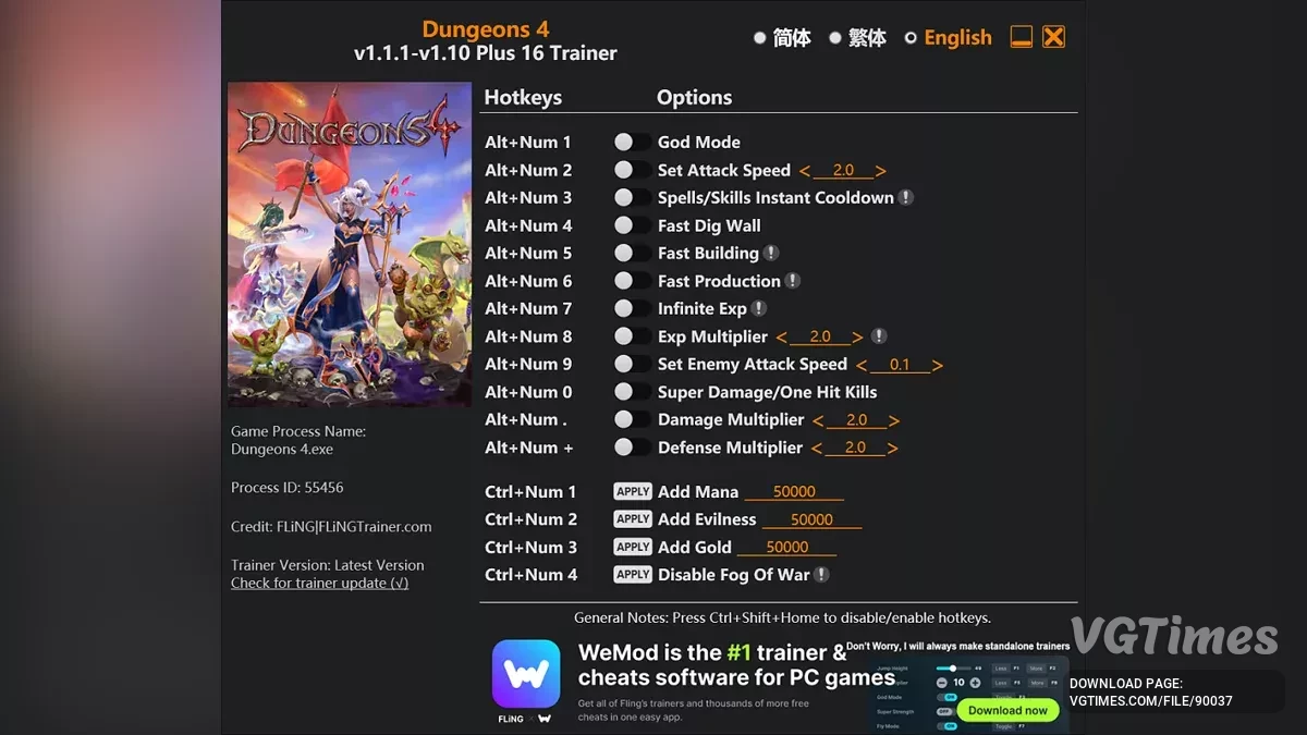 Функции и команды: Alt+Num 1 – God Mode — Режим бога. Alt+Num 2 – Set Attack Speed — Установить скорость атаки. Alt+Num 3 – Spells/Skills Instant Cooldown — Мгновенное восстановление умений/заклинаний. Alt+Num 4 – Fast Dig Wall — Быстрое рыть ...