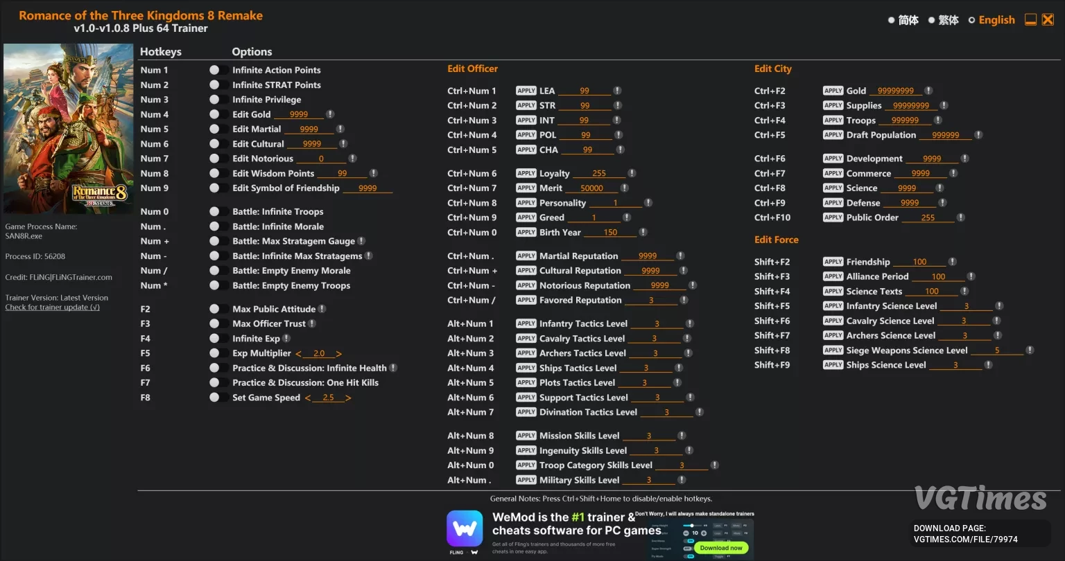 Romance of the Three Kingdoms 8 Remake — Трейнер (+64) [1.0 - 1.0.8]
