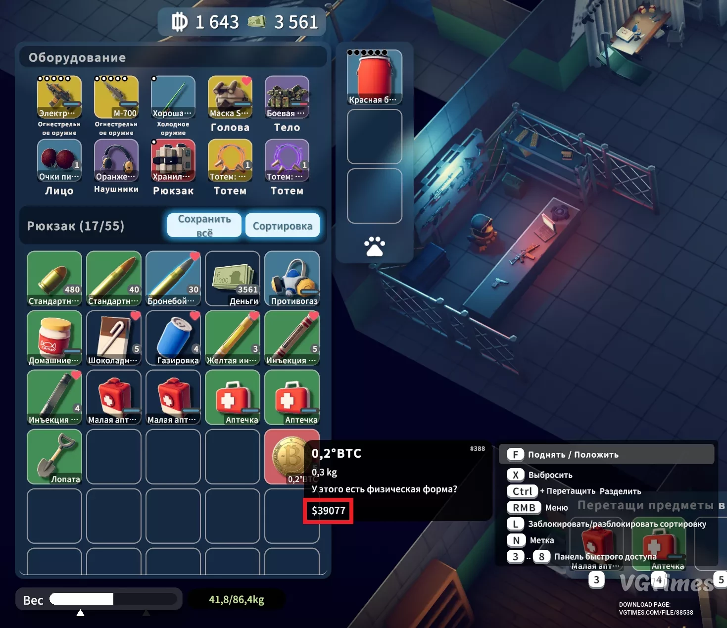 Показывает стоимость продажи предмета, так же учитывает состояние оружие\брони. Проверено на версии 1.0.30. Как запустить: Скачать файл; Распаковать папку DisplayItemValue в \Escape From Duckov\Duckov_Data\Mods; Если нет папки Mods то создат ...