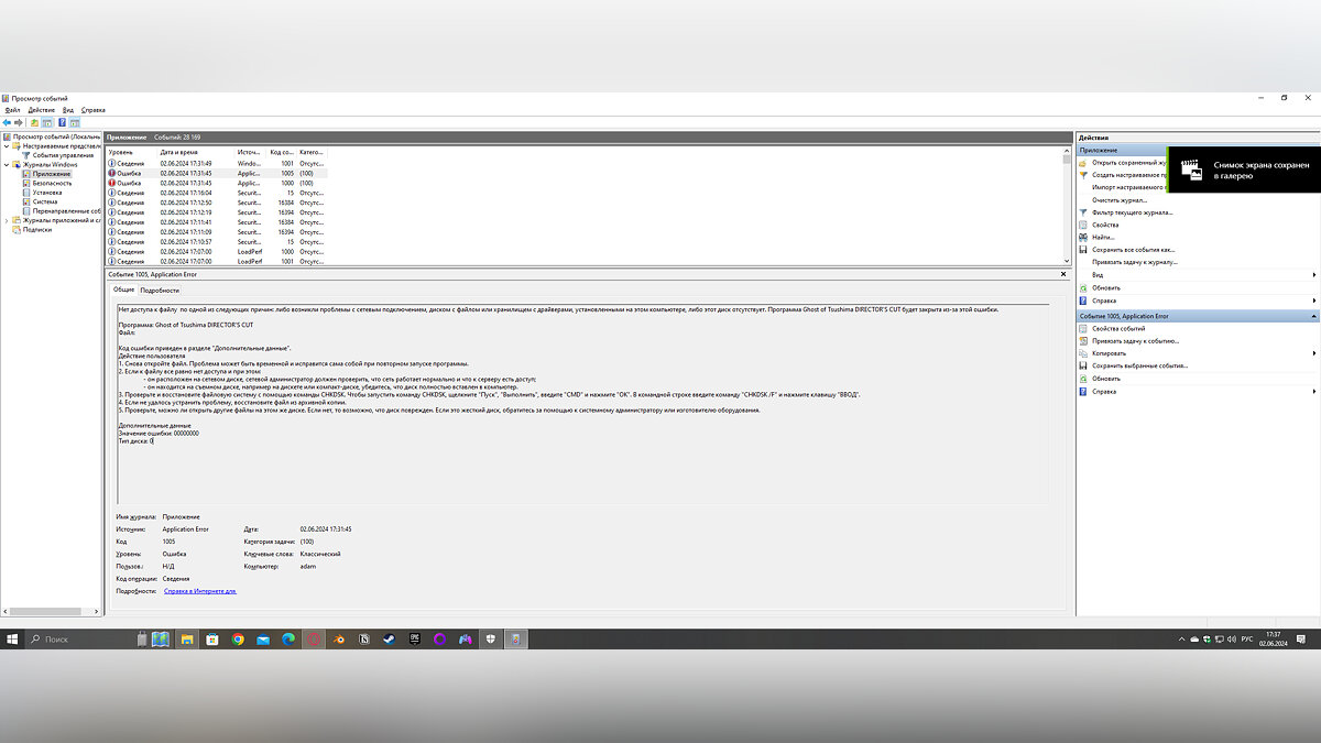 Вчера я наконец-то скачал в стим Призрака Цусимы, однако обнаружил, что игра никак не запускается. Никаких ошибок не происходит, просто игра 5 секунд запускается, а потом закрывается. Окно игры не открывается, всё происходит в стиме. Я новые драйвера ставил, перезагружал, устанавливал и удалял включённую в игру программу для PS, но всё одно и то же. Вам же, господа, могу предоставить лишь логи компа. Хз как это вообще поможет, но где-то в интернете было написано, что можно понять через них проблему и её решить.