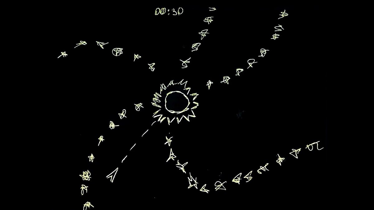 Игру скачивал на андроид. В аркадном, ретро-пиксельном стиле. Где ты летаешь вокруг центрального босса, который атакует разными атаками, а ты должен уворачиваться от них и ставить рекорд по выживанию на время. Фон в игре просто черный, надписи красные, а я и босс белого цвета. Чем дольше выживешь, тем сложнее атаки босса. Игра была бесплатной. Играл примерно в 2021–2023 году. Также прикреплю рисунок от руки с примерным геймплеем.