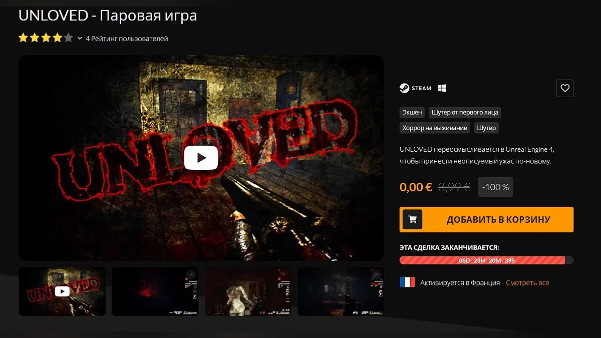 Стартовала новая бесплатная раздача игры для Steam. Речь идет о шутера от первого лица с элементами хоррора под названием UNLOVED, который получил очень положительные отзывы от геймеров (рейтинг 80% на момент написания новости).