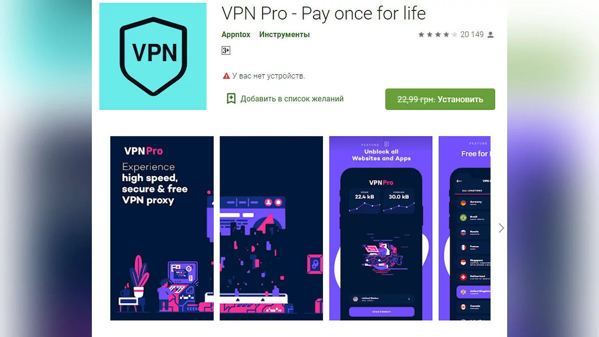 - VPN Pro — Pay once for life — сервис для доступа к заблокированным интернет-ресурсам (загрузить бесплатно).