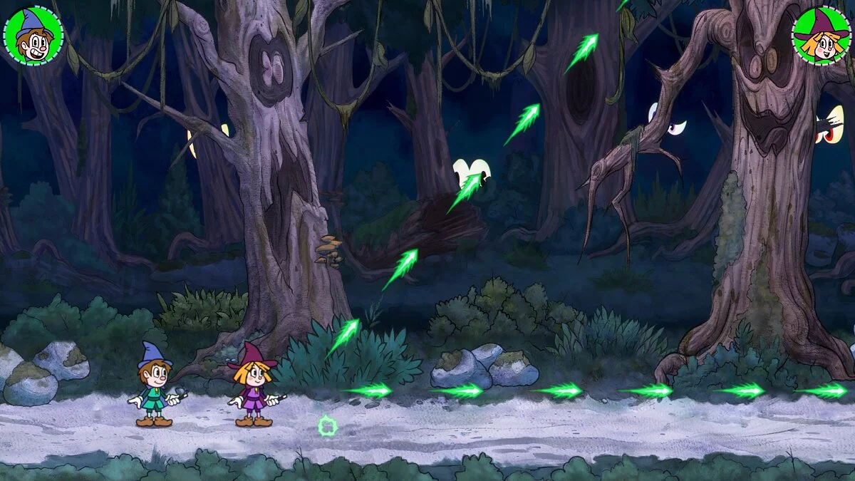 Тут сразу открывается первая проблема геймплея — сломанная динамика. В Cuphead приходилось выбирать пару вариантов «патронов» лишь перед уровнем, после чего игрок на это уже не отвлекался. Геймер концентрировался на происходящем и сохранял темп, подбирая лишь бонусы и жизни. В Enchanted Portals вы вынуждены постоянно притормаживать и нажимать дополнительные кнопки. При этом огонь, вода и яд ничем не отличаются, кроме цвета. Даже тот факт, что зеленые выстрелы летят сразу в трех направлениях на практике ничего не дает.