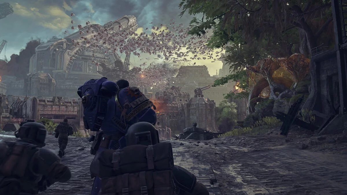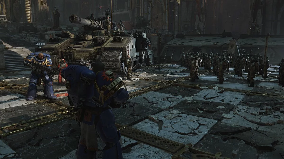 Вот и получается, что по-настоящему Warhammer 40,000: Space Marine 2 расцветает не в боевых однотипных уровнях, а в поставленных масштабных сценах на барже или в поле, когда обычные солдаты кланяются при виде вашей команды, мимо проезжают танки, тут же казнят дезертиров, а где-то в отдалении враг собирается с силами. Закрадываются крамольные мысли, что Saber Interactive нужно было делать не экшен, а эдакое интерактивное кино, где несколько сражений были бы плотно перемешаны с диалогами и выборами, постановочными эпическими моментами и QTE.