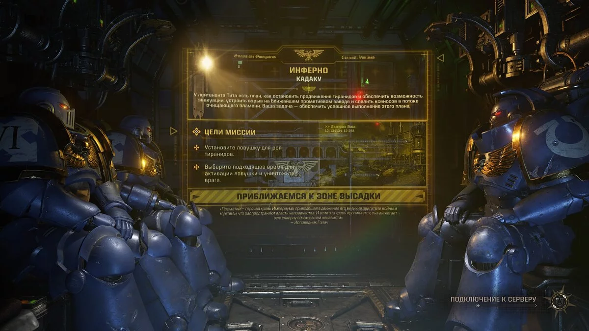 После каждой миссии вы будете возвращаться на боевую баржу — огромный корабль-город, который выступает сюжетным хабом, а также местом для выбора скудного снаряжения и переключения между одиночным и мультиплеерным режимами. Каждый элемент на звездолете проработан до мельчайших подробностей. Вот космодесантники обсуждают недавнюю миссию, вот пилот перечисляет ремонтникам повреждения вашего десантного корабля, а тут местные ученые препарируют особо крупного тиранида. Всё это постановка и оживает лишь при вашем приближении, но работает. Начинаешь проникаться бытом ультрамаринов и их жизнью на холодной неуютной барже.