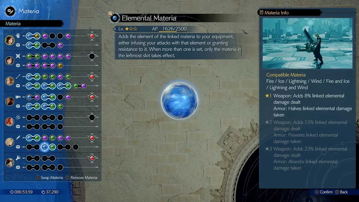 Японские RPG с натяжкой можно назвать «ролевыми» играми, в них нет явной нелинейности и обширной прогрессии. Тем не менее, в Rebirth присутствует система «настройки материй», позволяющая использовать новые способности и повышать характеристики. Вам всего лишь нужно собрать определенное количество магических шариков и вставить их в слоты экипировки. Звучит довольно просто, но благодаря новым типам материй и возможным комбинациям вы откроете больше стратегических возможностей и улучшите выживаемость героев в сражениях.