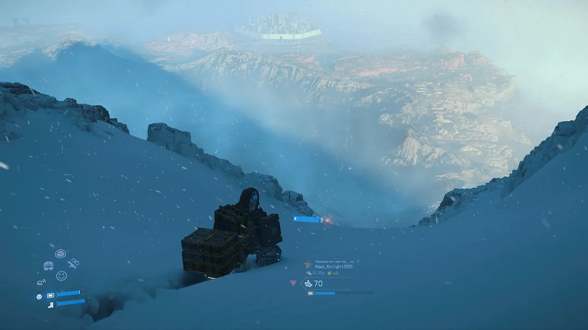 Машину пришлось оставить, взяв груз на хрупкие плечи. К тому же мы никак не ожидали такого развития событий: запас личных аккумуляторов стремительно падал, дополнительных ресурсов не было, а хиральные снег и дождь ухудшали состояние контейнеров с каждой минутой. И начался подъем. Когда система экзоскелета отказала, сильно ухудшая его баланс на отвесном склоне — мы начали переживать, что квест окажется провален. Лишь на последнем издыхании удалось добраться до очередной базы, подключить ее к сети и получить долгожданное облегчение.