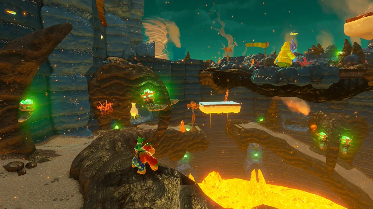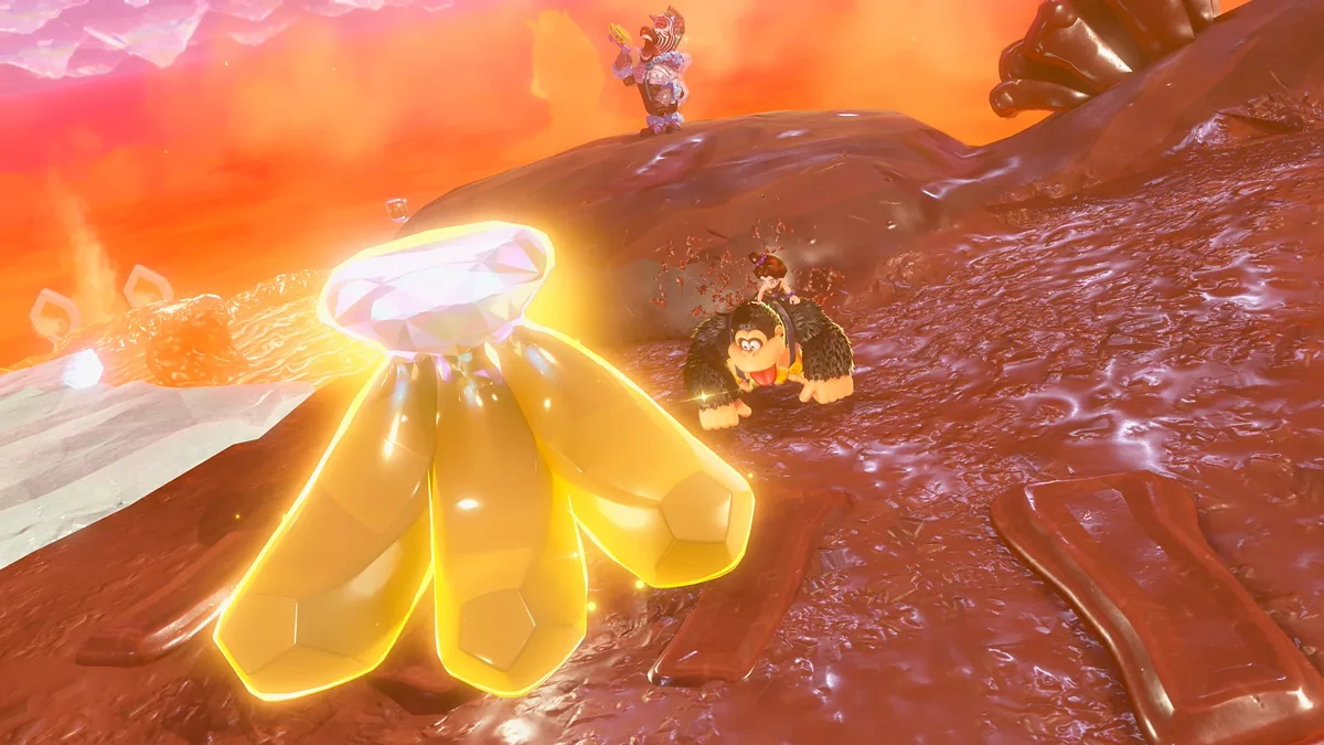 Вся эта комплексная система разрушаемости и взаимодействий между материалами построена на «скелете» Super Mario Odyssey. У Donkey Kong Bananza практически идентичная структура. Так, на каждом уровне игрока ждут два сражения с боссами — в середине и в конце. Сами локации набиты банандиевыми самоцветами — аналогами лун из Odyssey. Кроме того, на уровнях есть переходы в отдельные комнаты с испытаниями, причём во время некоторых из них игра ненадолго превращается в ретро 2D-платформер. Знакомо, не правда ли?