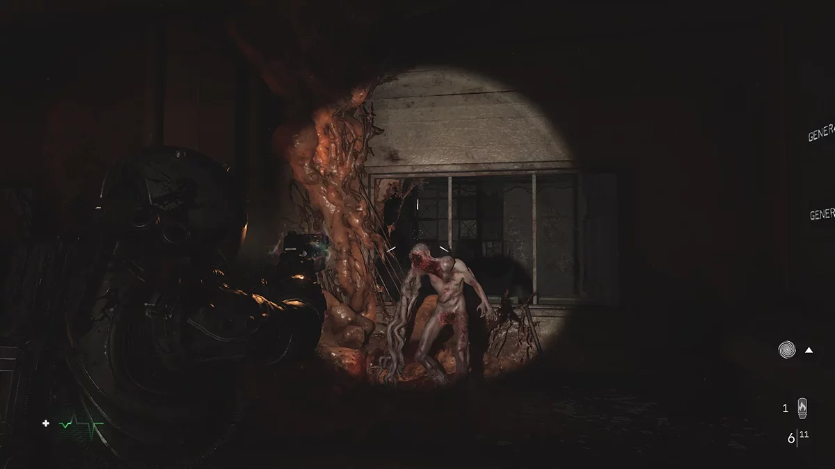 В игре есть небольшое количество боссов, сражения с которыми всегда происходят по одинаковому сценарию: вас запирают в очень узких коридорах с мощным противником и заставляют бегать сломя голову по арене, выцеливая уязвимые места. И несмотря на всю вторичность столкновений, сражения на удивление протекают очень бодро и держат в напряжении до самого финала. Во-первых, Путница очень медлительная и уязвимая в прямых столкновениях. Во-вторых, количества боеприпасов хватает ровно на сражение, поэтому каждый промах вызывает панику. Ну и в-третьих, здоровье персонажа тратится нереально быстро, из-за чего резко пропадает желание стоять столбом и стрелять в босса, пока патроны не закончатся. Именно в битвах с боссами Cronos: The New Dawn раскрывается как правильный survival horror с панической экономией ресурсов и поиском безопасных путей отступления. Жаль, конечно, что не вся игра работает по этим принципам.
