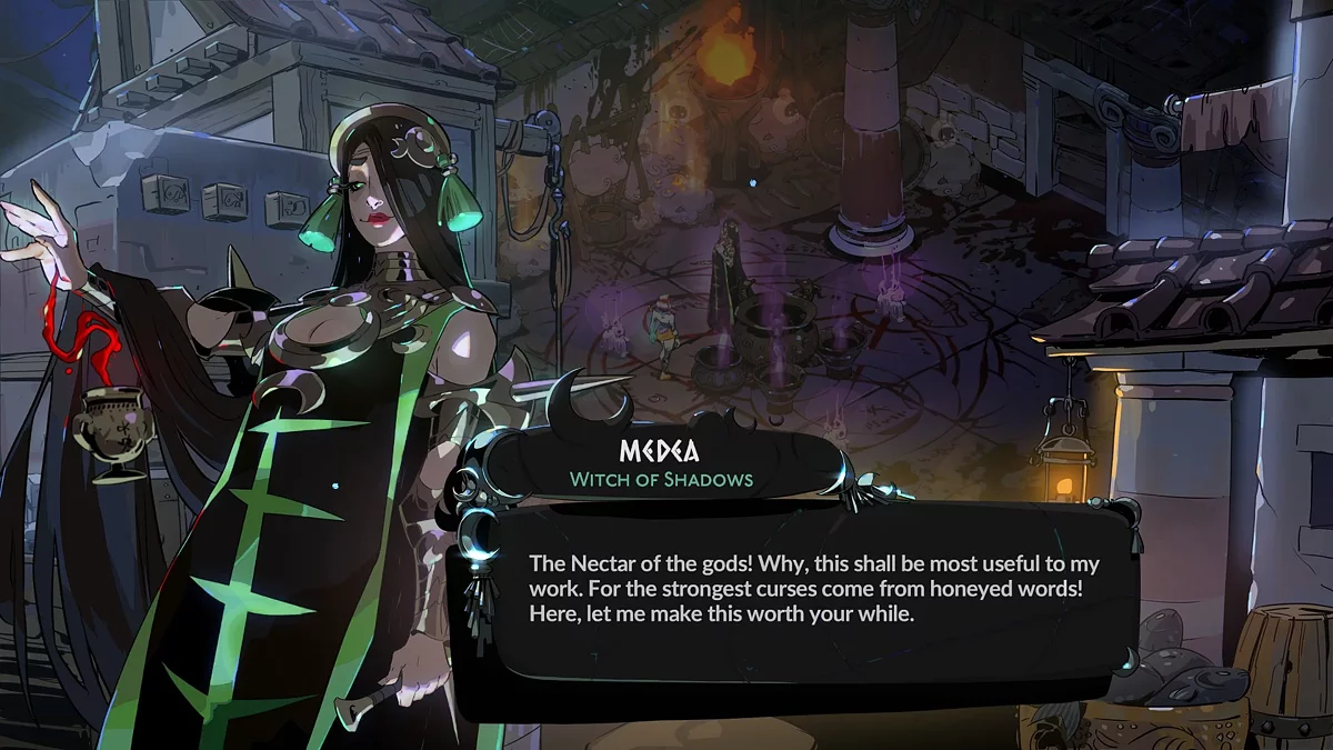 Мелиноя, как и её наставница Геката, — могущественная ведьма, и это имеет не только сюжетное значение, но и геймплейное. Так, посреди Распутья стоит огромный котёл, с помощью которого протагонистка может создавать мощные заклинания, упрощающие борьбу против армии титана времени. Например, если провести ритуал «Золотой источник жизни», то во время будущих забегов в Тартаре откроется доступ к особой зале, где Мелиноя сможет отдохнуть и восстановить здоровье. А можно создать чары, которые позволят приручать животных и превращать их в фамильяров, чтобы они дрались вместе с тобой.
