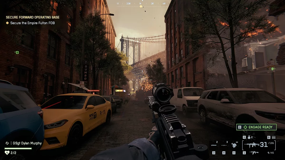Criterion и Motive даже не пытались придумать что-то свое и рассказать хоть какую-то историю. Каждая миссия и сценарный поворот — это дословная калька всего, что в том или ином виде было реализовано в играх серии Call of Duty. Убийство сослуживцев главного героя в самом начале игры? Есть. Босс-вертолет? На месте. Миссия с прибором ночного видения? Присутствует. Эпичный прыжок с парашютом? Да! А еще: злодеи пытаются похитить президента, снайперская миссия на обширной территории, подрыв Бруклинского моста и, конечно, финальная пробежка под эпичную музыку. Более того, в игре есть даже собственный Гоуст, который, к слову, просто из ниоткуда появился в команде главного героя без предыстории и сюжетного обоснования.