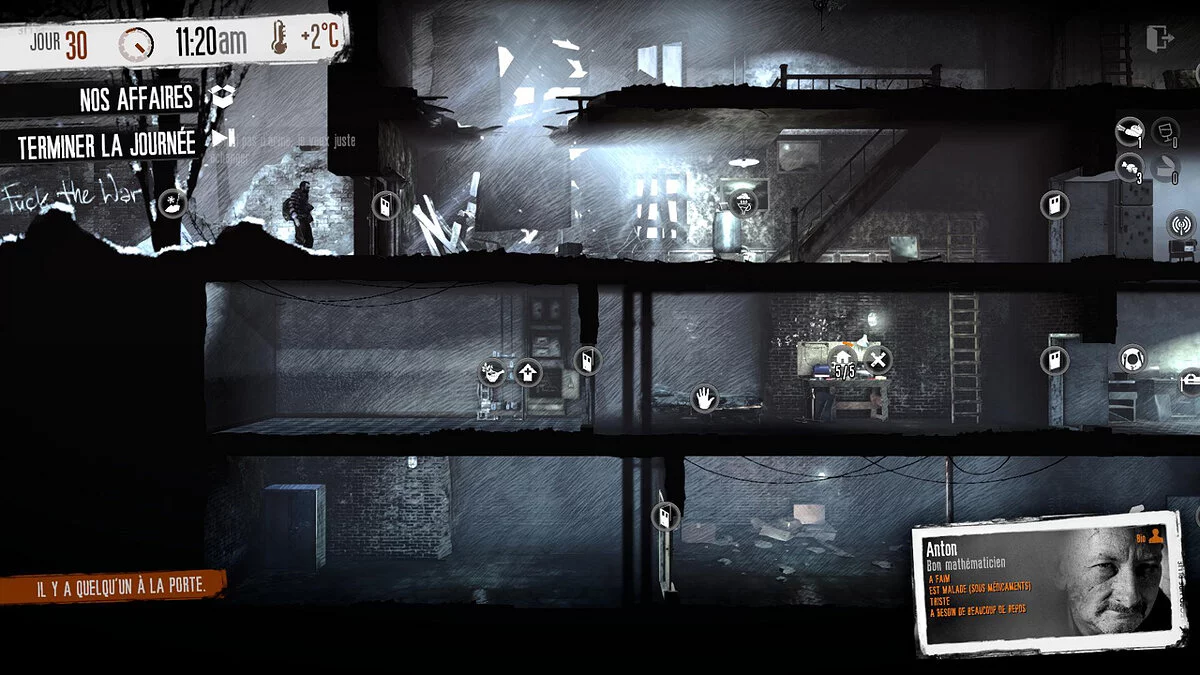 Каждый раз приходится делать выбор. Если кто-то хочет присоединиться к группе — это лишняя пара рук, но и еды в таком случае нужно больше. И во время одной из ночных вылазок вы можете кого-нибудь потерять, сделав не правильное движение: ловкая девушка, которая всегда взламывала замки и спасала других в сложных ситуациях, больше не сможет идти с вами. Эта игра беспощадна. Разработчики сделали правильный выбор, когда решили дать игрокам возможность почувствовать весь страх и переживания, которые люди чувствовали во время разных войн. И все сводится к одному стремлению. Стремлению выжить.