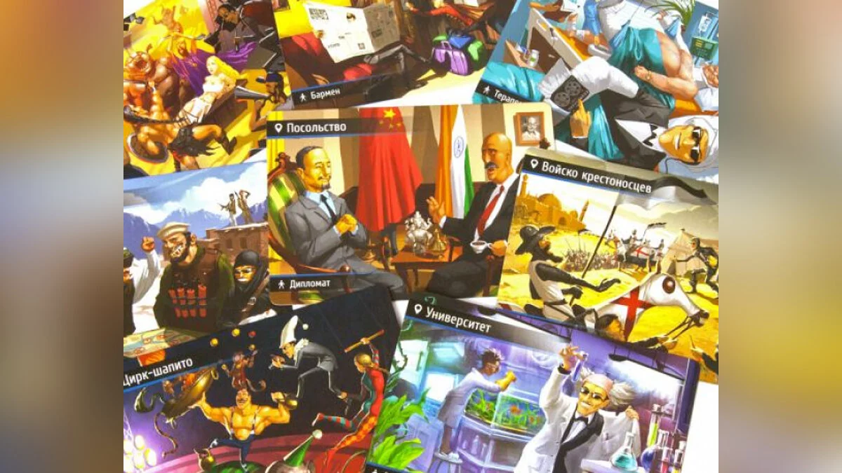 И начнем мы с коробки. Игра поставляется в небольшой квадратной формы коробке, открыв которую вы найдете игральные карты, очень много игральных карт. 240 штук. Вы спросите, зачем так много? А мы ответим: надо! Дело в том, что действие игры происходит в 30 разных локациях. Именно на столько наборов делятся карты (если не учитывать набор карт шпионов). Каждый набор — это определенная локация (больница, театр, цирк-шапито, киностудия и так далее). Каждая из семи карт одного набора (одной локации) указывает на род профессии. Например, в больнице есть главврач, хирург, терапевт, патологоанатом, медсестра, интерн и пациент.