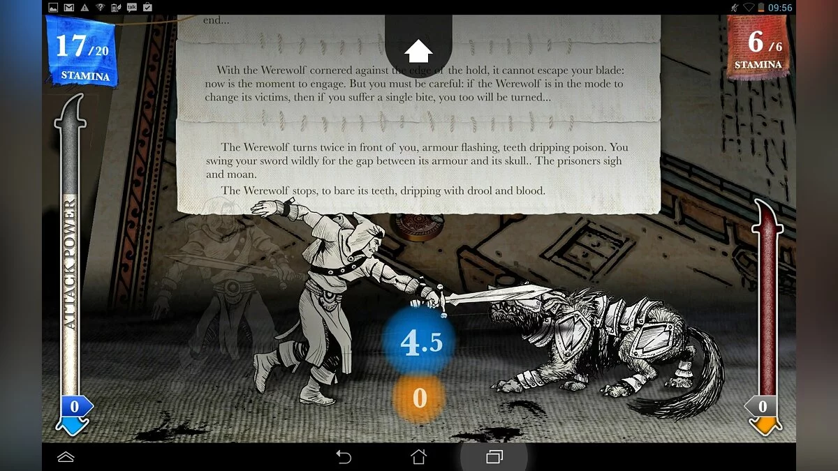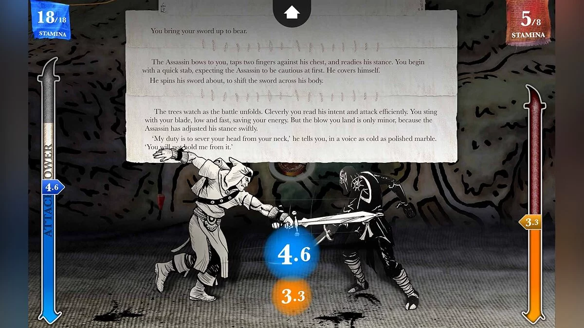 Тем не менее, иногда боя не избежать вовсе, и тогда Sorcery! демонстрирует игроку довольно простую, но изящную боевую систему. Бой разделен на раунды, в каждом из которых нам необходимо выбрать, сколько выносливости мы вкладываем в удар. Далее идет сравнение выбранного количества с тем, которое выбрал оппонент, после чего мы либо наносим ему повреждения, либо сами их получаем.