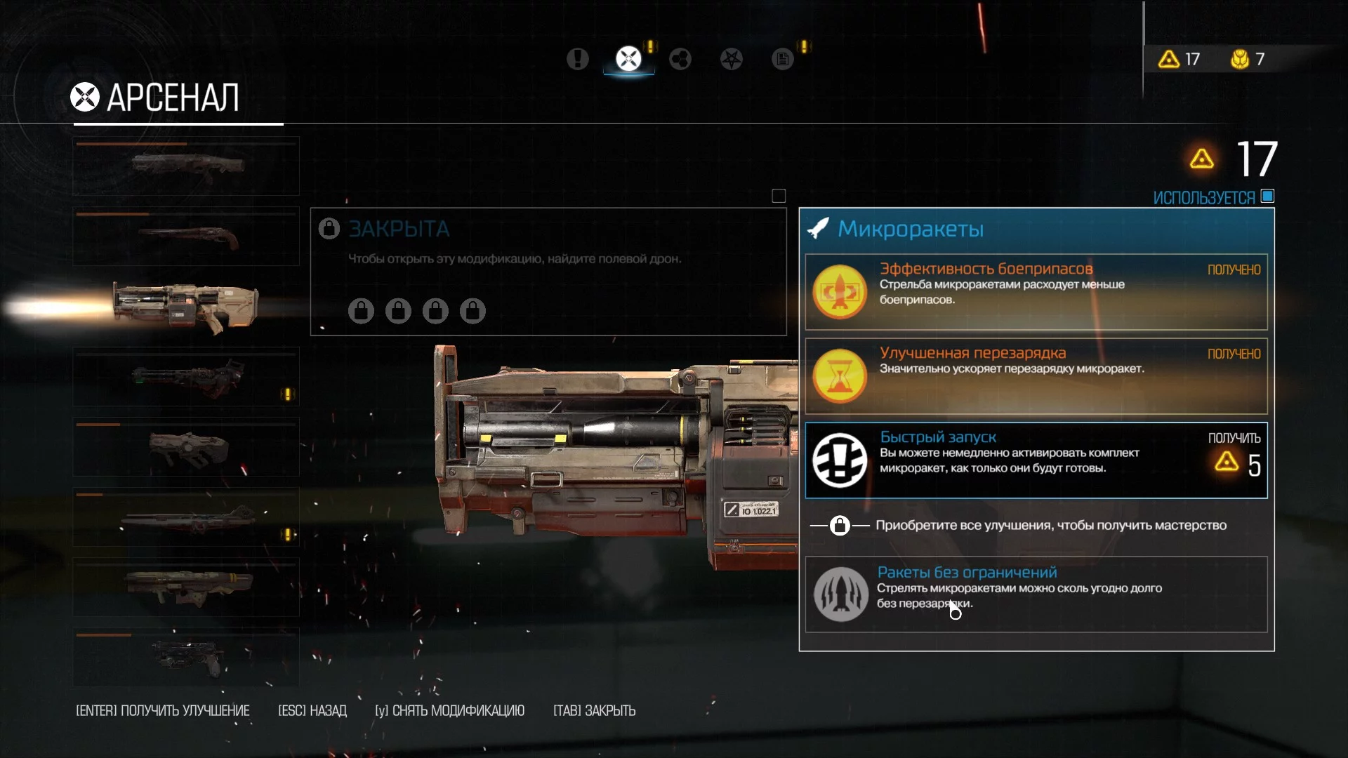 Аналогичная ситуация и с оружием, только там возможностей для прокачки больше, поскольку вы сначала открываете модуль, а затем уже усиливаете оружие вместе с той или иной модификацией при помощи улучшений.