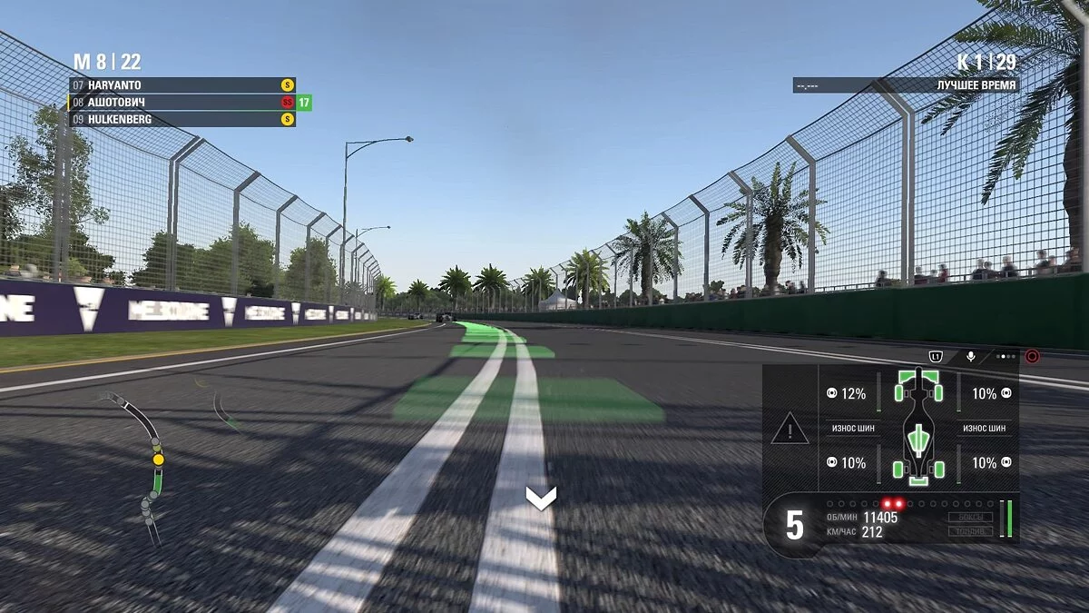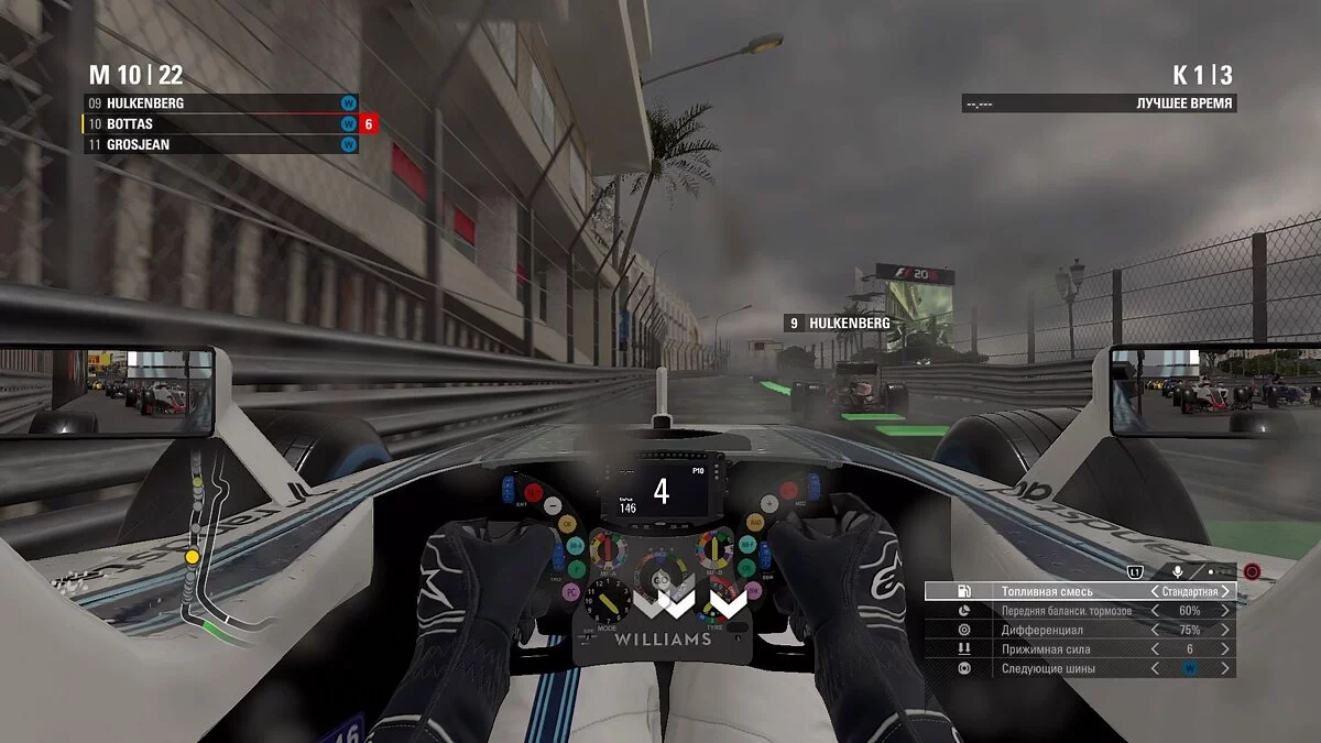 Здесь начинается настоящая стратегия. В проливной ливень шины изнашиваются меньше, но нужно выбрать наиболее мягкие для лучшего сцепления с дорогой. Ехать лучше всего по главной траектории, вся остальная дорога не пригодна для адекватной езды из-за излишней сырости. На сухой трассе приходится бережнее относится к шинам, выбирать, когда использовать твердые наборы (с ними проще закреплять лидерство, когда не нужно делать крутых маневров) и, опять же, мягкие — они изнашиваются намного быстрее.